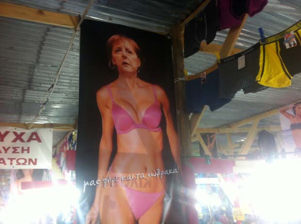 Ιδιοκτήτης παράγκας όπου πουλούσε εσώρουχα, είχε κρεμάσει μεγάλη αφίσα όπου εικονίζονταν η Γερμανίδα καγκελάριος με εσώρουχα (με φωτομοντάζ) ενώ από κάτω όπως διαβάζετε και στη φωτογραφία, έγραφε “μας πήρε και τα σώβρακα”!