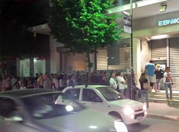 Οι ραγδαίες εξελίξεις στο εσωτερικό της χώρας και η απόφαση να κλείσουν οι τράπεζες για την ερχόμενη εβδομάδα έχουν προκαλέσει πανικό σε εκατοντάδες Λαρισαίους που έσπευσαν το βράδυ της Κυριακής να κάνουν ανάληψη από τα αυτόματα μηχανήματα της Εθνικής Τράπεζας στην Κεντρική Πλατεία, πριν τεθούν όρια στις αναλήψεις.