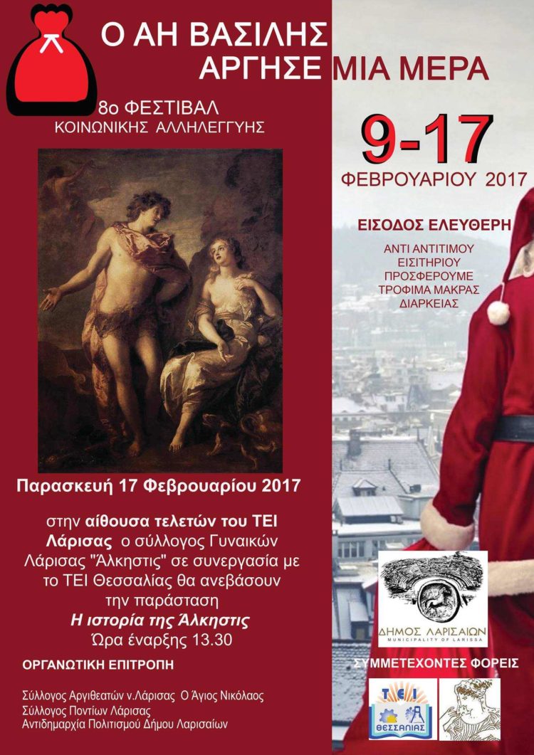 Παρασκευή 17/2/2017: Στην αίθουσα τελετών του ΤΕΙ Λάρισας, παρουσιάζεται η παράσταση «Η ιστορία της Άλκηστις» του Συλλόγου Γυναικών Λάρισας «Άλκηστις» σε συνεργασία με το ΤΕΙ Θεσσαλίας.