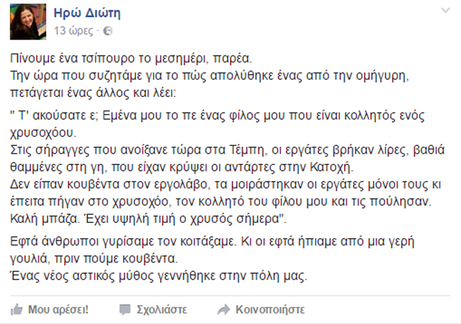 Δεν θέλει και πολύ κάτι που μπορεί να πεις σε μια παρέα των ώρα που πίνεις ένα τσίπουρο να γίνει αστικός μύθος. Ειδικά όταν η ιστορία μιλά για θαμμένες λίρες κατά την εποχή της κατοχής τότε ο μύθος γίνεται πιο εύπεπτος.