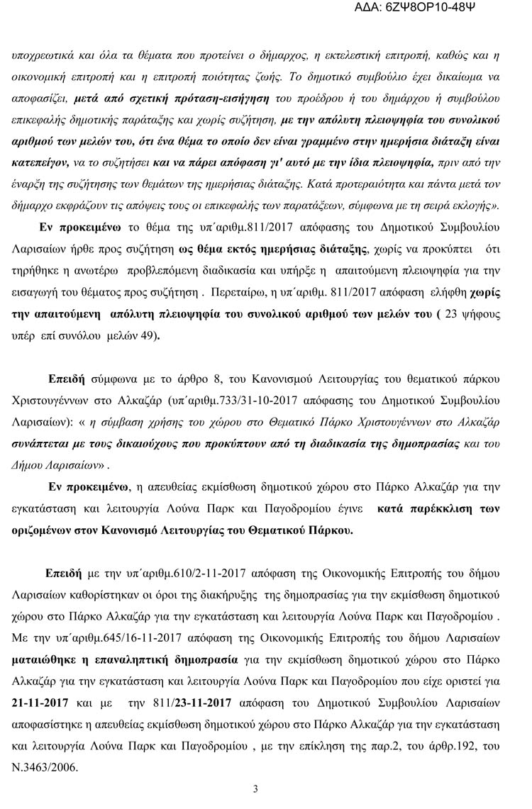 - «η απευθείας εκμίσθωση δημοτικού χώρου στο Πάρκο Αλκαζάρ για την εγκατάσταση και λειτουργία Λούνα Παρκ και Παγοδρομίου έγινε κατά παρέκκλιση των οριζομένων στον Κανονισμό Λειτουργίας του Θεματικού Πάρκου»,