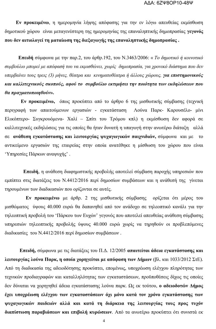 - «η ημερομηνία λήψης απόφασης για την εν λόγω απευθείας εκμίσθωση δημοτικού χώρου είναι μεταγενέστερη της ημερομηνίας της επαναληπτικής δημοπρασίας γεγονός που δεν αιτιολογεί τη ματαίωση της διεξαγωγής της επαναληπτικής δημοπρασίας»,