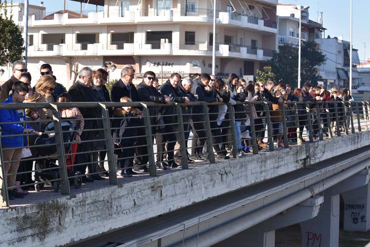 Αργότερα η πομπή μετακινήθηκε στην πεζογέφυρα του Αλκαζάρ, εκεί όπου ο τίμος σταυρός έπεσε στα παγωμένα νερά του Πηνειού ποταμού και μαζί μ’ αυτόν τέσσερις τολμηροί Λαρισαίοι.
