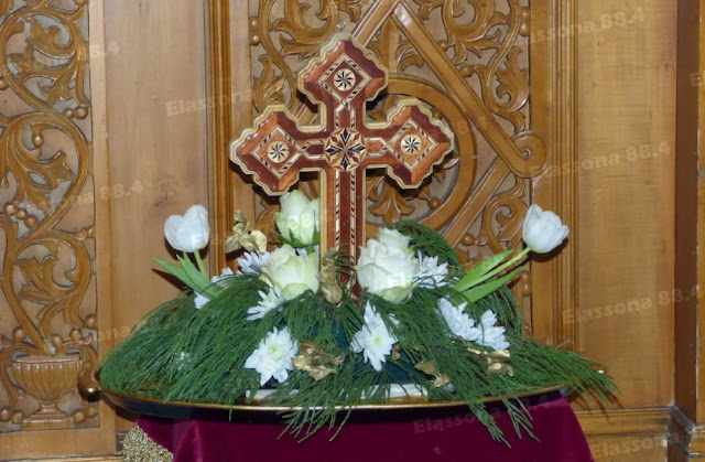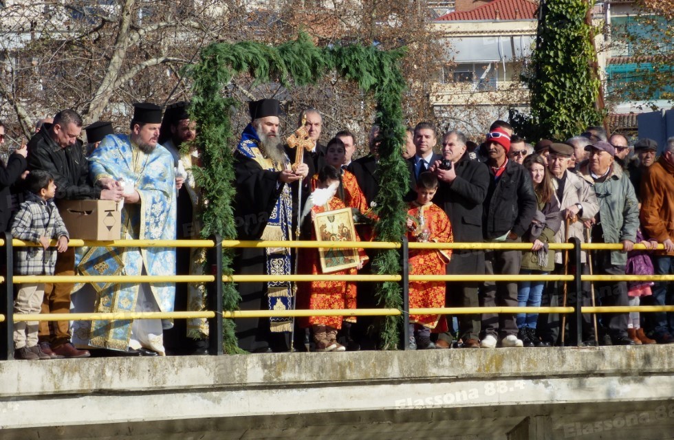 Εκεί, όπως γίνεται κάθε χρόνο, κατά μήκος της κοίτης του ποταμού, είχαν συγκεντρωθεί πολλοί Ελασσονίτες, για να παρακολουθήσουν την καθιερωμένη ρίψη του Τιμίου Σταυρού. Ο μητροπολίτης κ. Χαρίτων, αφού άφησε να πετάξουν ελεύθερα τα λευκά περιστέρια (…όπως απαιτεί το έθιμο), έριξε τον Σταυρό στα νερά του «παγωμένου» Ελασσονίτη, όπου βούτηξαν τέσσερις τολμηροί νεαροί κολυμβητές.