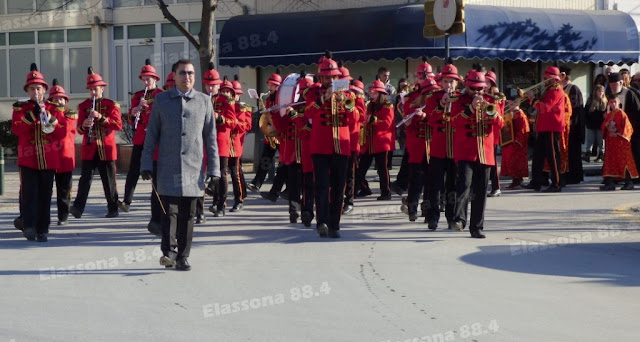 Στη συνέχεια, λίγο πριν τις 11, σχηματίσθηκε πομπή, με επικεφαλής τη Φιλαρμονική του δήμου Ελασσόνας (υπό τη διεύθυνση του αρχιμουσικού της κ. Δημ. Τσιαβέ), και κατευθύνθηκε στη γέφυρα του ποταμού Ελασσονίτη, που διασχίζει την πόλη.