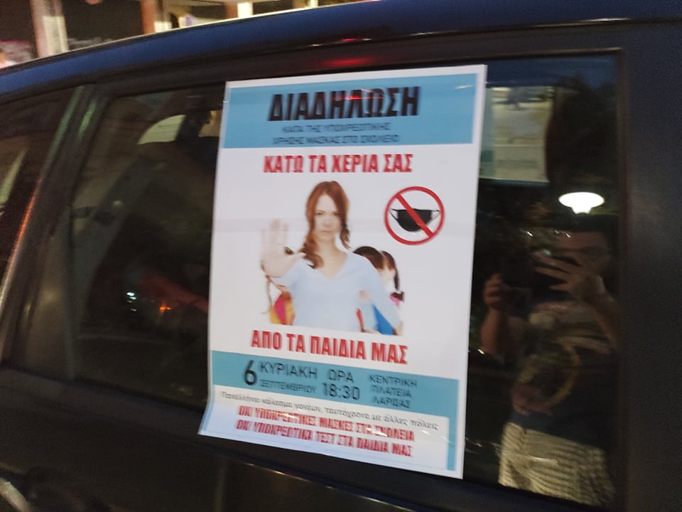 Όχηματοπορεία κατά της χρήσης μάσκας στα σχολεία πραγματοποιήθηκε το απόγευμα της Κυριακής από γονείς στην πόλη της Λάρισας.