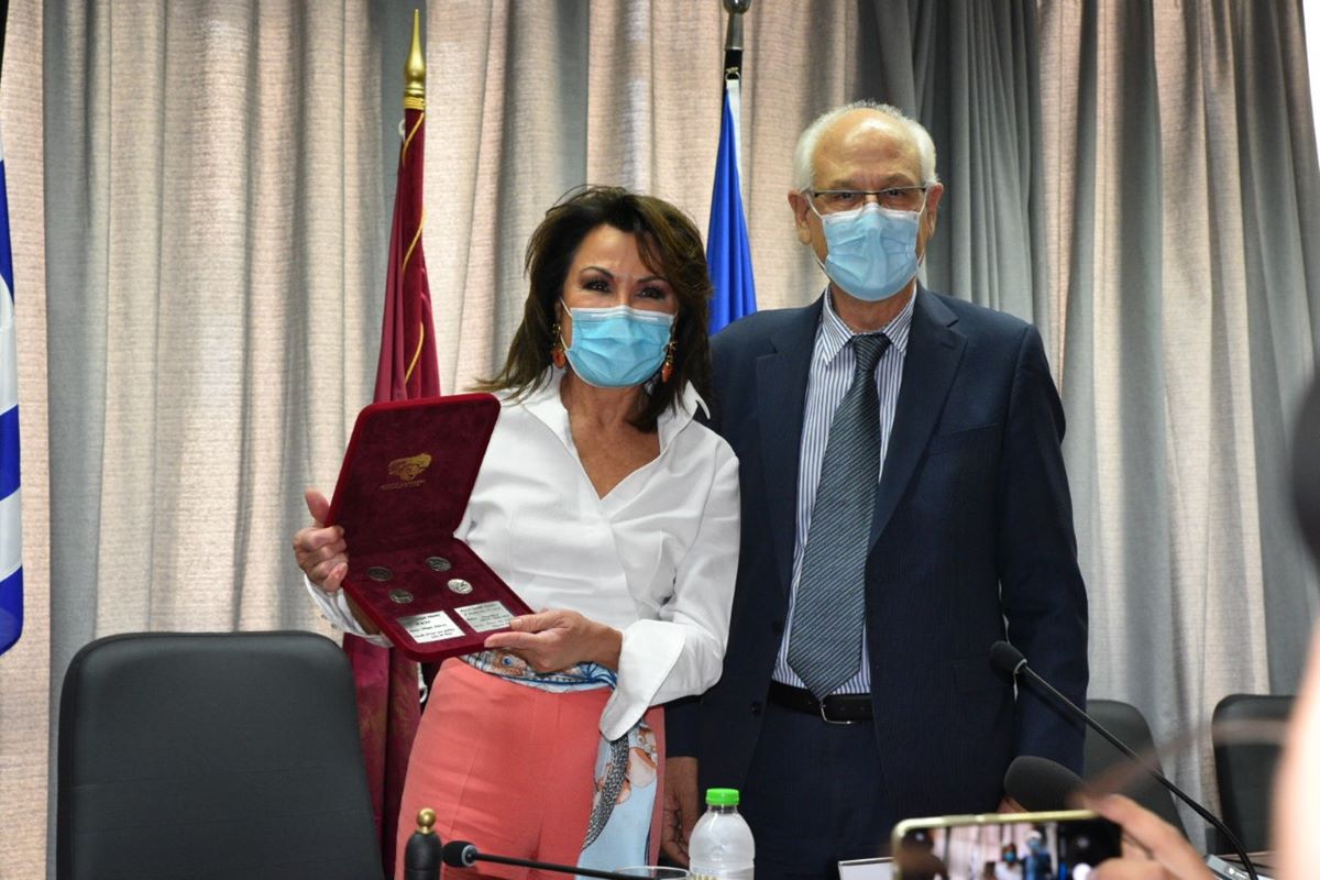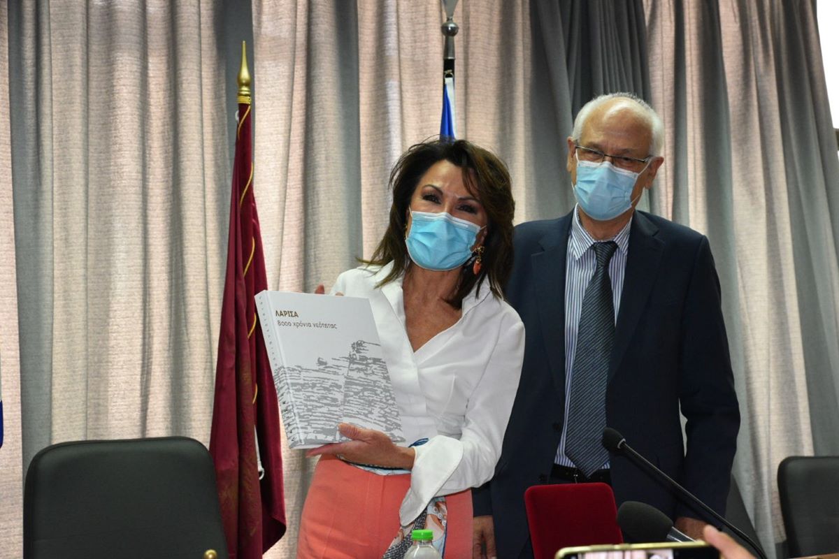 Ο κ. Καλογιάννης πρόσφερε ως δώρα στην κ. Αγγελοπούλου το βιβλίο με τίτλο: “Λάρισα 8000 χρόνια Νεότητας” καθώς και κασετίνα με συλλεκτικά νομίσματα.