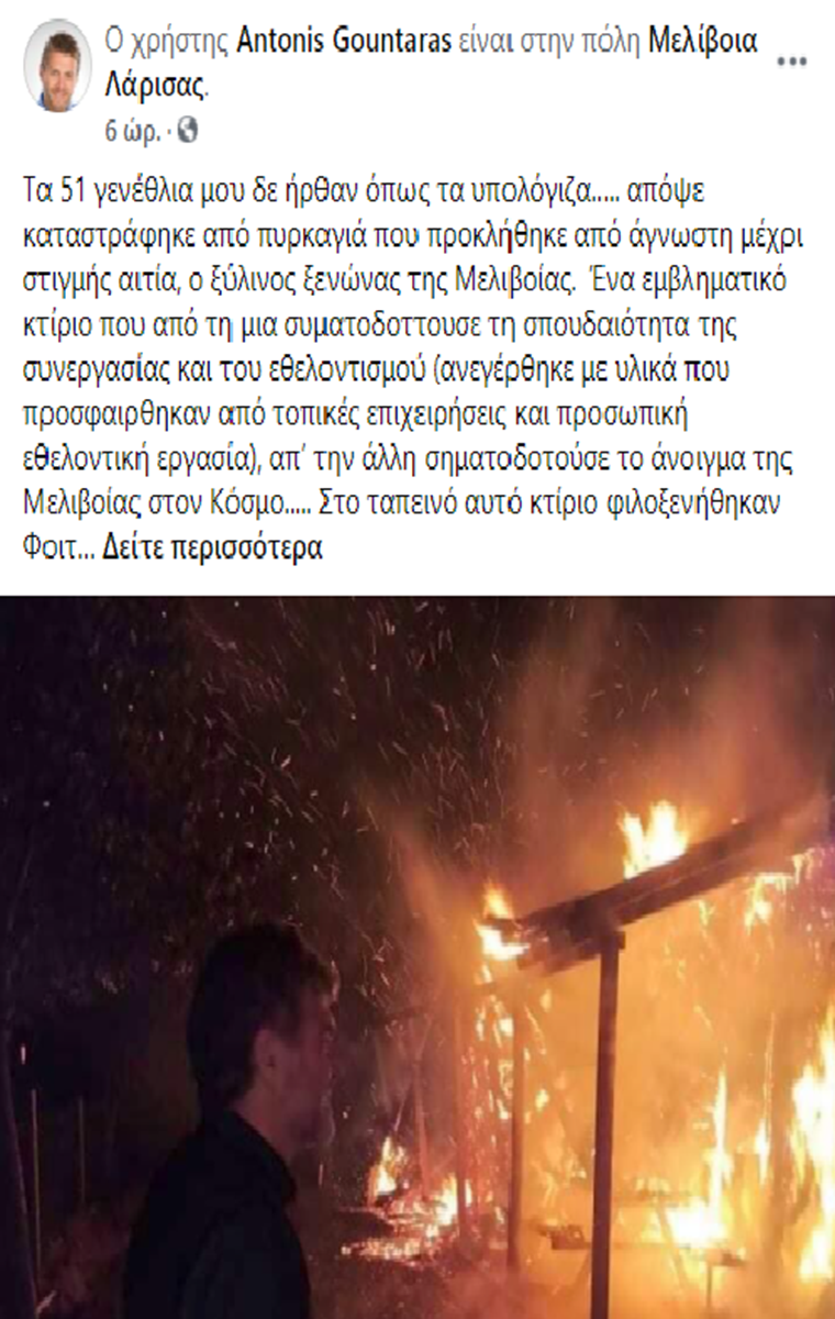 “Τα 51 γενέθλια μου δε ήρθαν όπως τα υπολόγιζα….. απόψε καταστράφηκε από πυρκαγιά που προκλήθηκε από άγνωστη μέχρι στιγμής αιτία, ο ξύλινος ξενώνας της Μελιβοίας. Ένα εμβληματικό κτίριο που από τη μια σηματοδοτούσε τη σπουδαιότητα της συνεργασίας και του εθελοντισμού (ανεγέρθηκε με υλικά που προσφέρθηκαν από τοπικές επιχειρήσεις και προσωπική εθελοντική εργασία), απ’ την άλλη σηματοδοτούσε το άνοιγμα της Μελιβοίας στον Κόσμο….. Στο ταπεινό αυτό κτίριο φιλοξενήθηκαν Φοιτητές και Καθηγητές από Πανεπιστήμια της Ελλάδας και της Ευρώπης, Σπουδαίοι Αρχαιολόγοι που εργάστηκαν για την ανάδειξη της ιστορικότητας του τόπου, ποδοσφαιρικές ομάδες, ορειβατικοί και περιπατητικοί σύλλογοι, Μουσικά σχήματα και θεατρικές ομάδες. Διέμειναν τα παιδιά μας από την αδελφή Πόλη του Ettenheim συνοδευόμενα απ’ τους Καθηγητές τους και το Δήμαρχο Bruno Metz…. Όσο και να φαίνεται παράξενο σ’ αυτό το κτίριο στεγάστηκαν όνειρα και ελπίδες για τη δημιουργία μιας κουλτούρας που να βασίζεται στη προσφορά, στο λιτό τρόπο ζωής, στην επαφή με τη φύση……