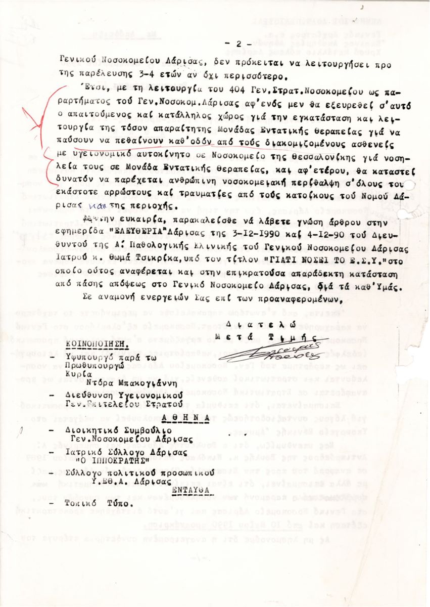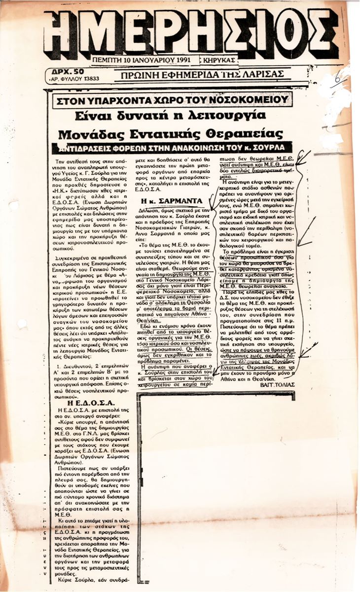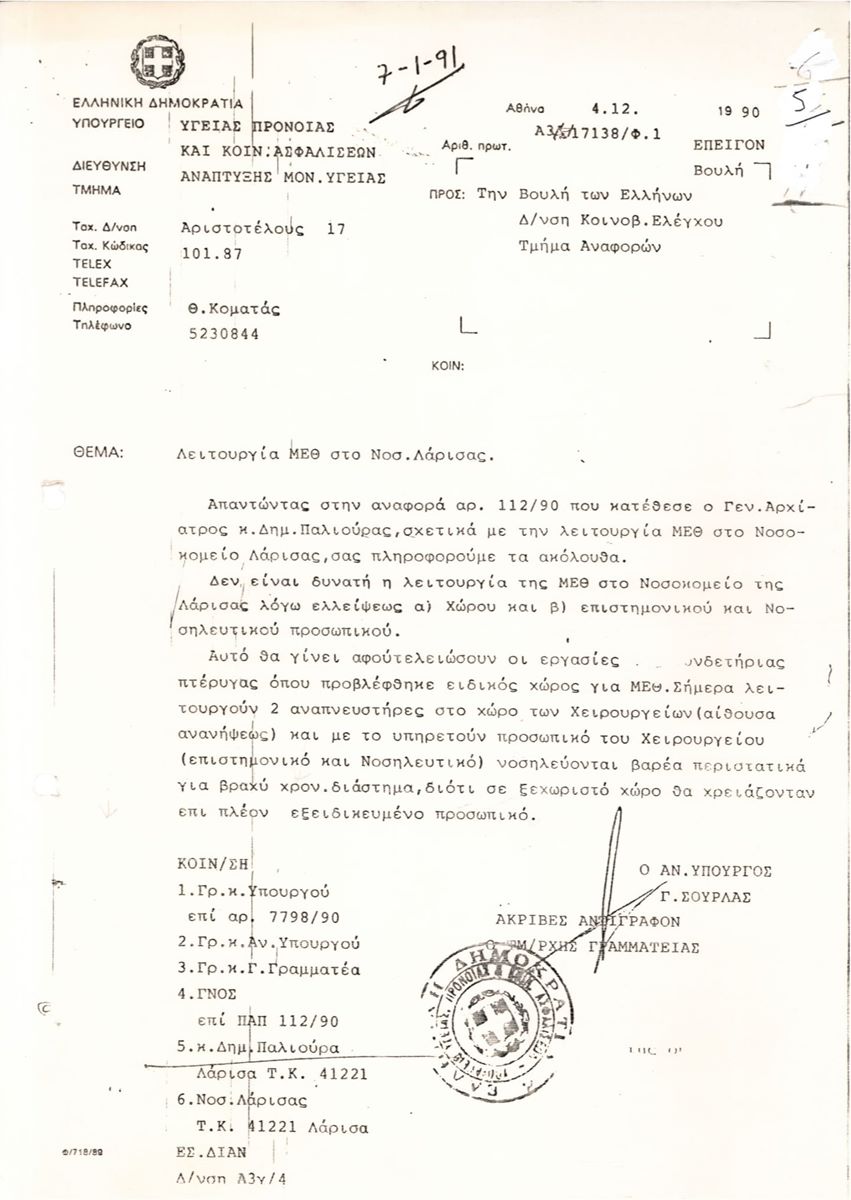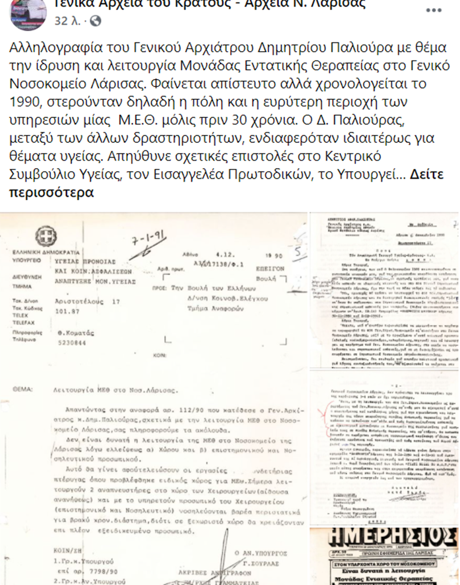 Όταν ο αρχίατρος Δ. Παλιούρας έκανε αγώνα για να λειτουργήσει ΜΕΘ στο Γενικό Νοσοκομείο Λάρισας – Έγγραφα ντοκουμέντα