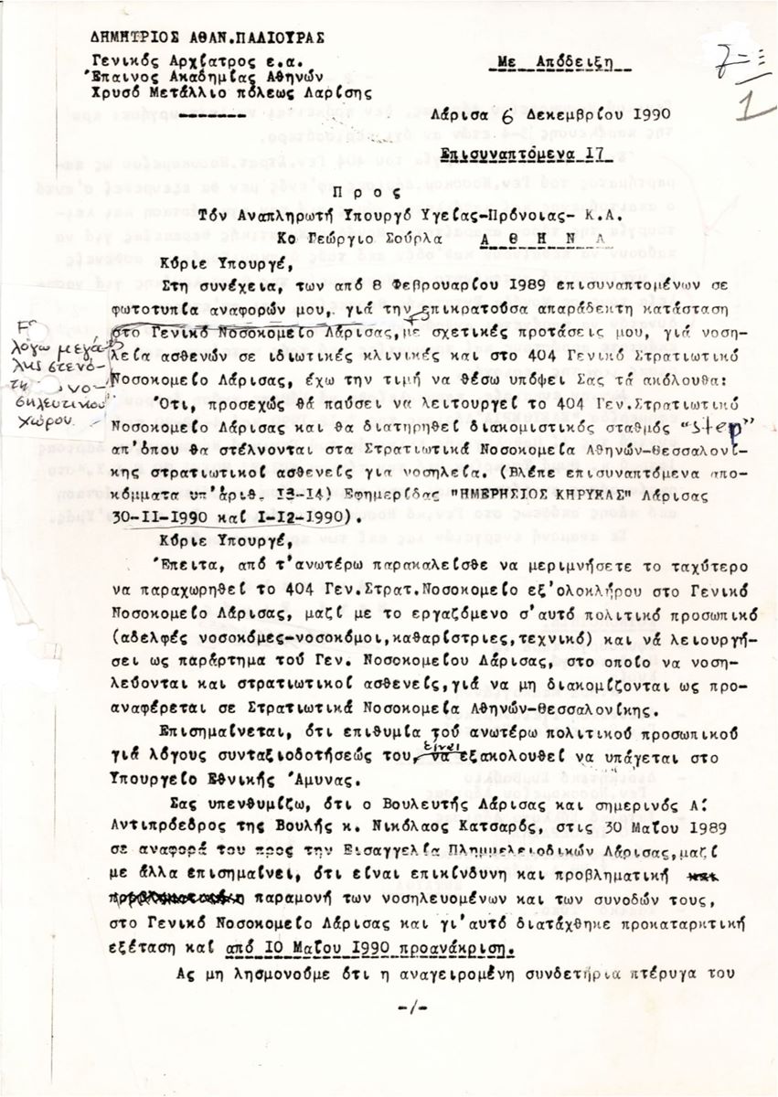 «Αλληλογραφία του Γενικού Αρχιάτρου Δημητρίου Παλιούρα με θέμα την ίδρυση και λειτουργία Μονάδας Εντατικής Θεραπείας στο Γενικό Νοσοκομείο Λάρισας. Φαίνεται απίστευτο αλλά χρονολογείται το 1990, στερούνταν δηλαδή η πόλη και η ευρύτερη περιοχή των υπηρεσιών μίας Μ.Ε.Θ. μόλις πριν 30 χρόνια. Ο Δ. Παλιούρας, μεταξύ των άλλων δραστηριοτήτων, ενδιαφερόταν ιδιαιτέρως για θέματα υγείας. Απηύθυνε σχετικές επιστολές στο Κεντρικό Συμβούλιο Υγείας, τον Εισαγγελέα Πρωτοδικών, το Υπουργείο Υγείας και Πρόνοιας, τον Πρωθυπουργό και τον Πρόεδρο της Δημοκρατίας, χωρίς να λαμβάνει πάντα απάντηση.