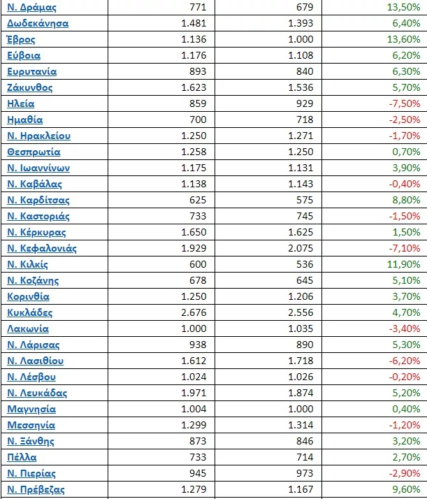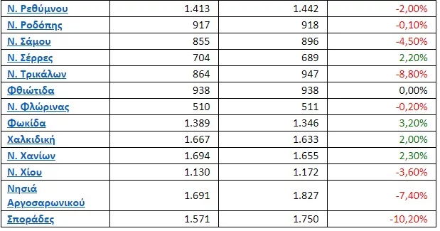 Η μεγαλύτερη αύξηση (13,6%) καταγράφηκε στον Έβρο και η μεγαλύτερη μείωση (-10,2%) στις Σποράδες. Η υψηλότερη μέση ζητούμενη τιμή καταγράφεται στις Κυκλάδες (2.676 ευρώ/τ.μ.) και η χαμηλότερη στη Φλώρινα (510 ευρώ/τ.μ.).