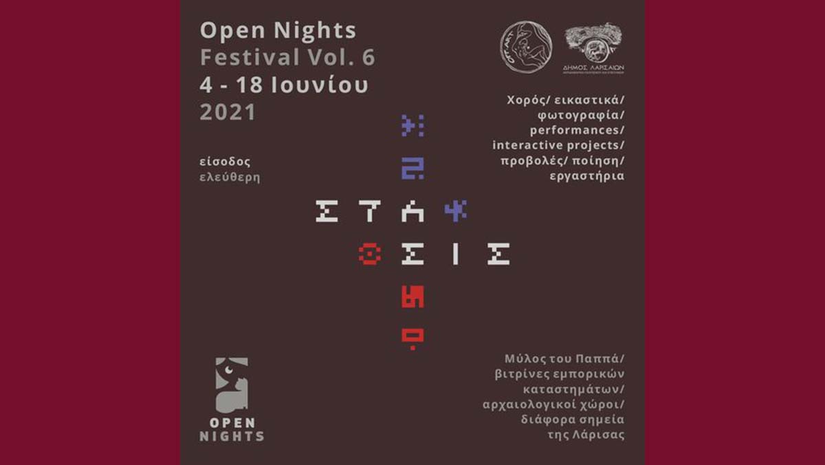 Το 6ο διακαλλιτεχνικό φεστιβάλ Open Nights, διοργανώνεται από τις 4 ως τις 18 Ιουνίου από την ομάδα χορού OFF ART – Σκηνικές Παρουσίες και την Αντιδημαρχία Πολιτισμού και Επιστημών Δήμου Λαρισαίων, σε συνεργασία με την Εφορεία Αρχαιοτήτων Λάρισας.
