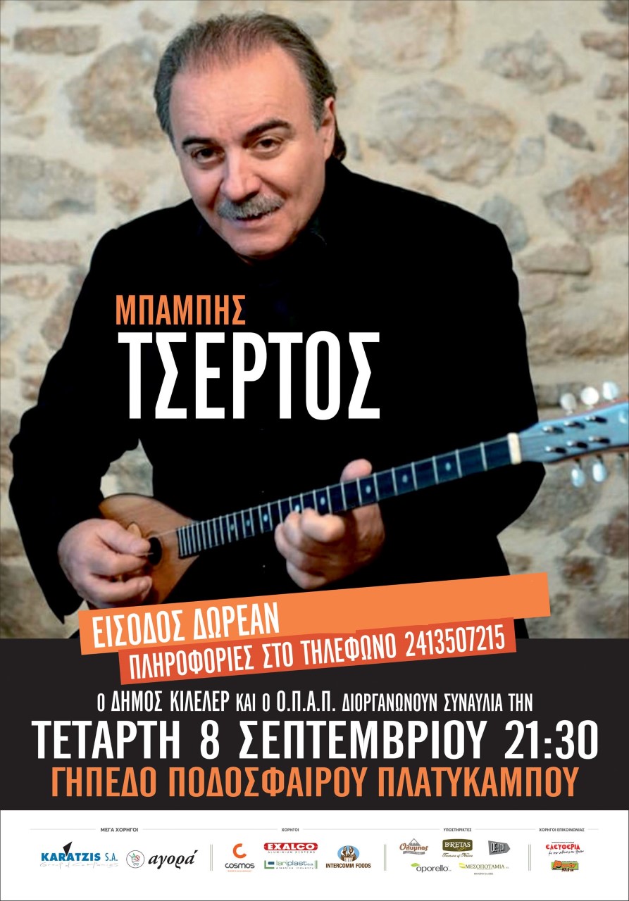 Συνεχίζονται οι πολιτιστικές εκδηλώσεις στο Δήμο Κιλελέρ. Την Τετάρτη 8 Σεπτεμβρίου στις 21:30 στο γήπεδο του Πλατυκάμπου θα εμφανιστεί ο Μπάμπης Τσέρτος. Η είσοδος είναι δωρεάν. Θα τηρηθούν όλα τα πρωτόκολλα ασφαλείας για τον Covid 19.