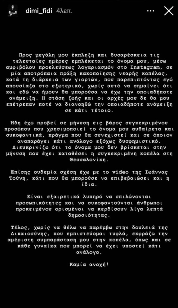 «Προς μεγάλη μου έκπληξη και δυσαρέσκεια τις τελευταίες ημέρες εμπλέκεται το όνομά μου, μέσω αμφιβόλου προελεύσεως λογαριασμών στο Instagram σε μια αποτρόπαια πράξη κακοποίησης νεαρής κοπέλας, κατά τη διάρκεια των γιορτών, που παρεμπιπτόντως εγώ απουσίαζα στο εξωτερικό, χωρίς αυτό να σημαίνει ότι και εδώ να ήμουν θα μπορούσα να είχα την οποιαδήποτε ανάμειξη. Η στάση ζωής και οι αρχές μου δεν θα μου επέτρεπαν ποτέ να διανοηθώ την οποιαδήποτε ανάμειξη σε κάτι τέτοιο.