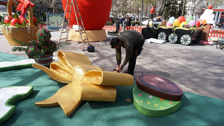 Ένα μικρό πασχαλινό χωριό, με εποχικές κατασκευές και σκηνικά, στήνεται στην Κεντρική Πλατεία της Λάρισας για να προετοιμάσει το κλίμα ενόψει του Πάσχα.