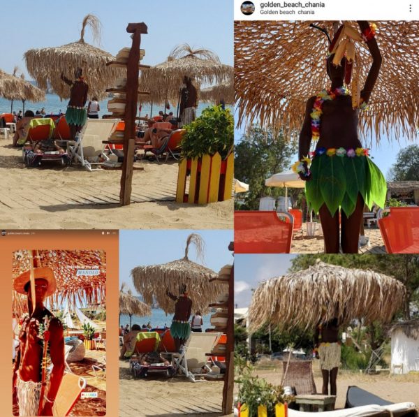 Οι άλλοι στη Χρυσή Ακτή στα Χανιά έβαλαν μαύρες κούκλες ομοιώματα να κρατάνε ομπρέλες. Αφού δεν έβαλαν και ανθρώπους να τις κρατάνε με τέτοια δουλεία που υπάρχει στον τουρισμό, πάλι καλά να λέμε.