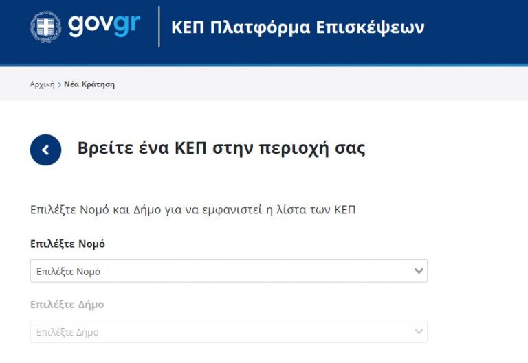 1. Αρχικά, ο πολίτης εισέρχεται στο rantevou.kep.gov.gr με τους κωδικούς του στο Taxisnet και επιλέγει «Νέο ραντεβού», προσδιορίζοντας τον νομό και τον δήμο όπου επιθυμεί να εξυπηρετηθεί.