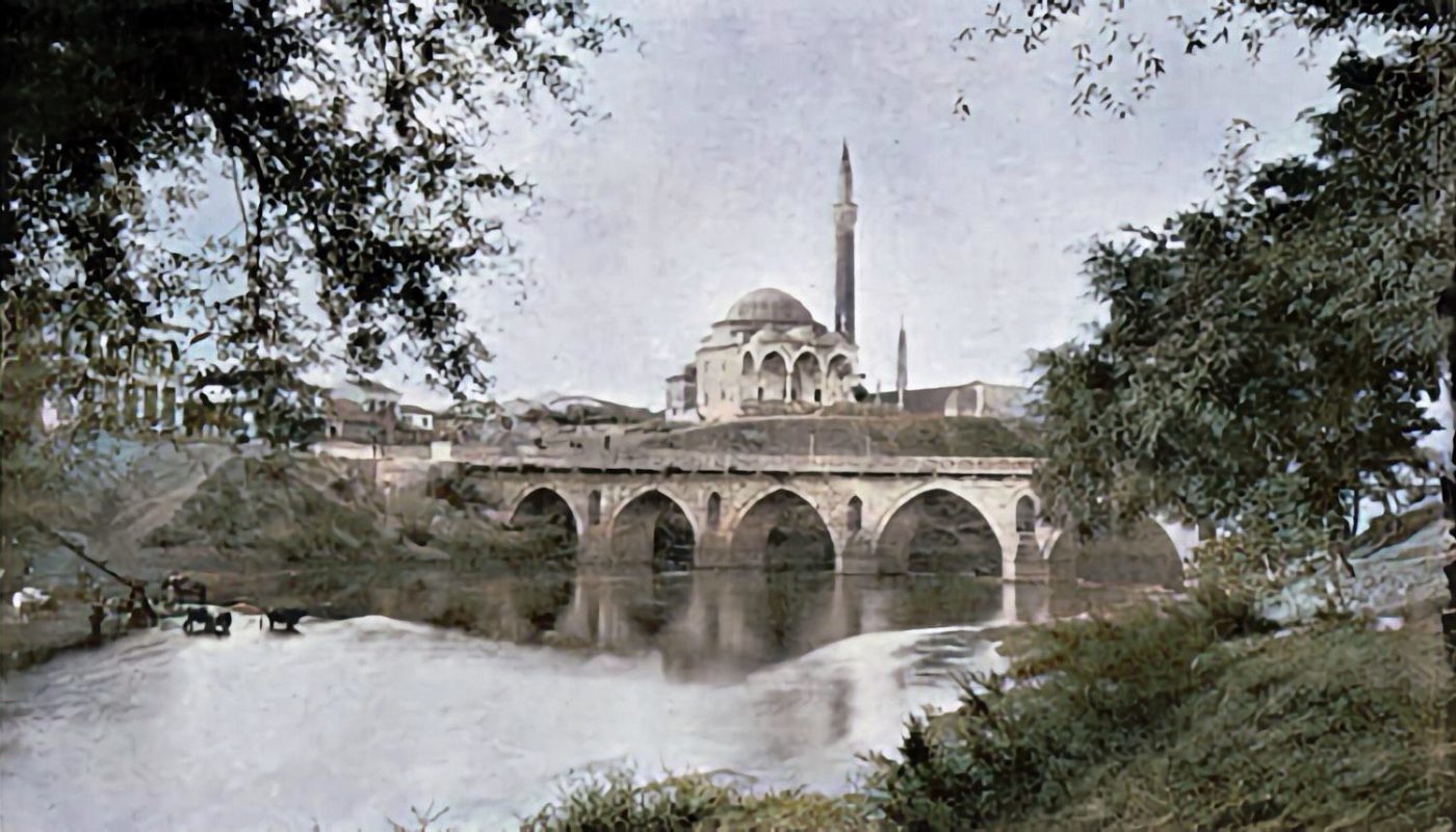 Στη φωτογραφία πάνω: Το Πράσινο τέμενος (τζαμί του Χασάν μπέη) και η μεγάλη λίθινη γέφυρα της Λάρισας επί του Πηνειού. Από το βιβλίο του Clive Bigham «With the Turkish Army in Thessaly».