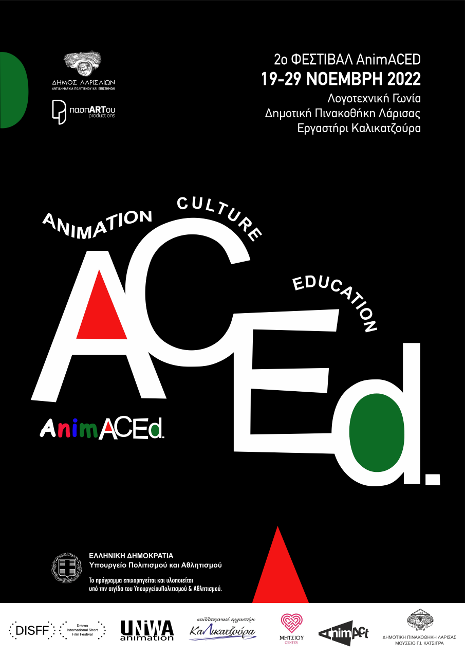 Η Πολιτιστική και Καλλιτεχνική ομάδα Πασπαρτού σε συνεργασία με την Αντιδημαρχία Πολιτισμού και Επιστημών του Δήμου Λαρισαίων, διοργανώνουν το 2ο Φεστιβάλ “AnimACEd.” στη Λάρισα, από τις 19-29 Νοεμβρίου 2022, υπό την αιγίδα του ΥΠΠΟΑ, στη Λογοτεχνική Γωνία, τη Δημοτική Πινακοθήκη Λάρισας και το Εργαστήρι Καλικατζούρα.