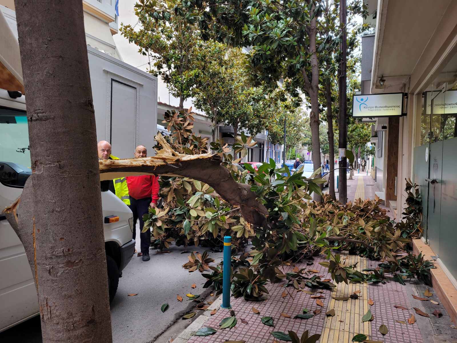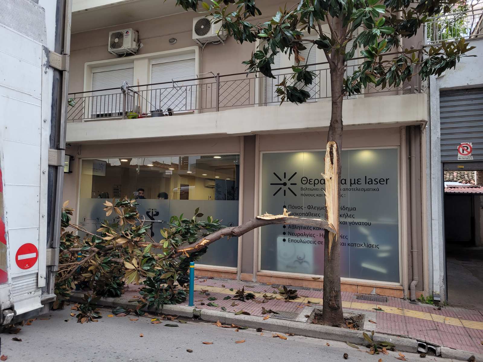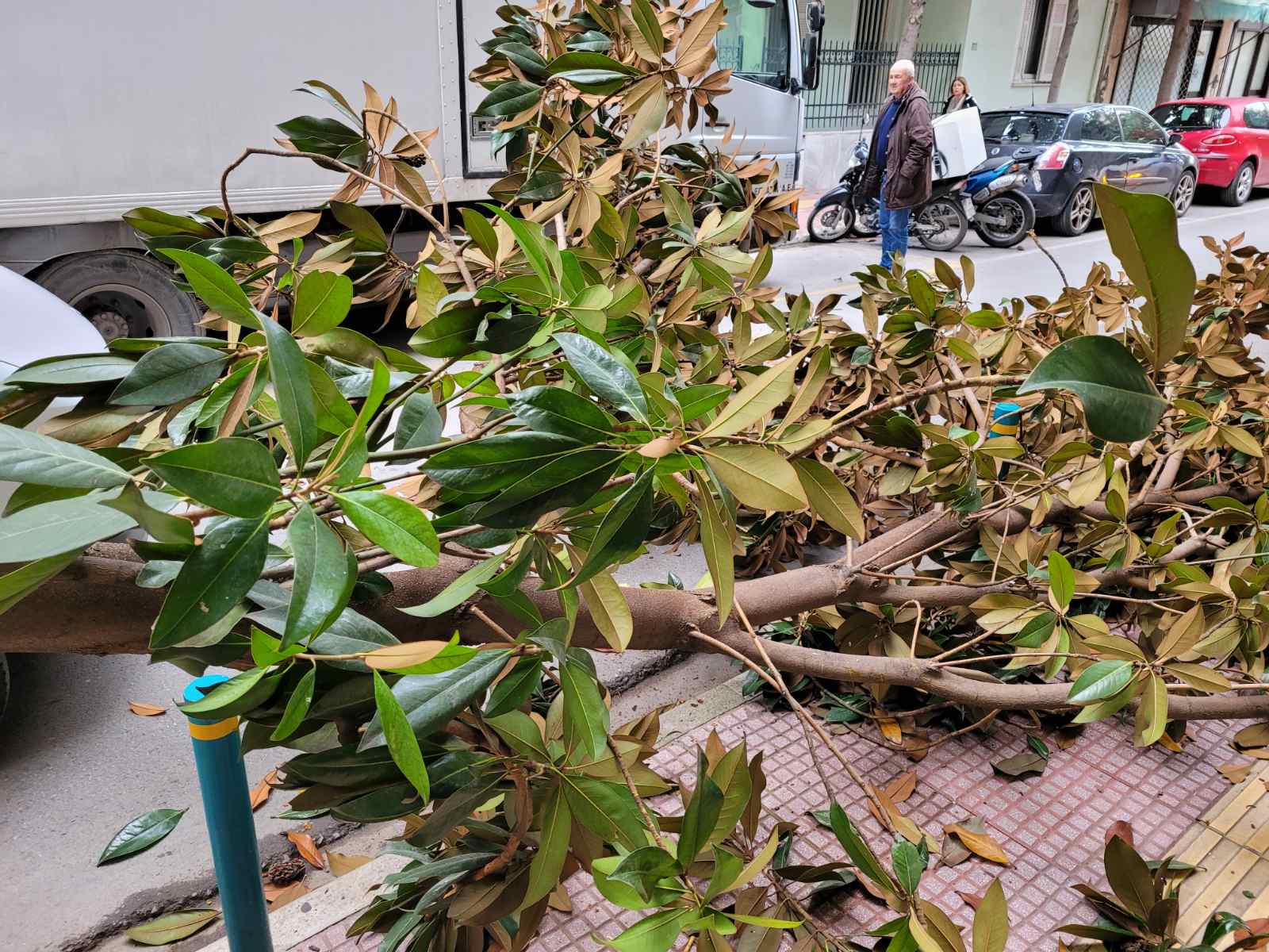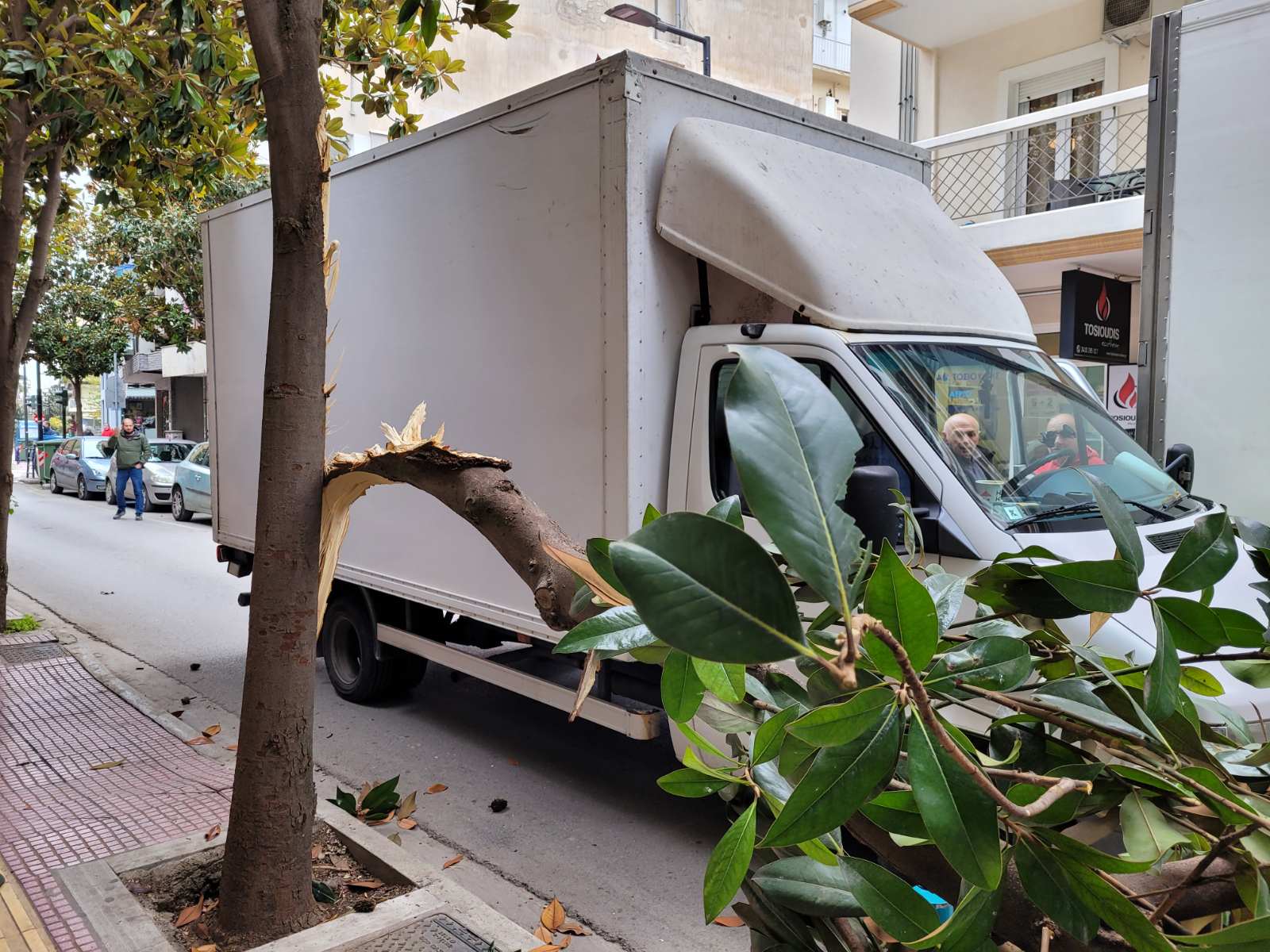 Φορτηγό διερχόμενο από τον συγκεκριμένο δρόμο δυσκολευόταν να περάσει καθώς ένα άλλο βαρύ όχημα ήταν διπλοπαρκαρισμένο στο σημείο, με αποτέλεσμα το πρώτο φορτηγό να «ξηλώσει» το μισό δέντρο που βρίσκεται στο πεζοδρόμιο και αυτό να… σκορπίσει στο οδόστρωμα.