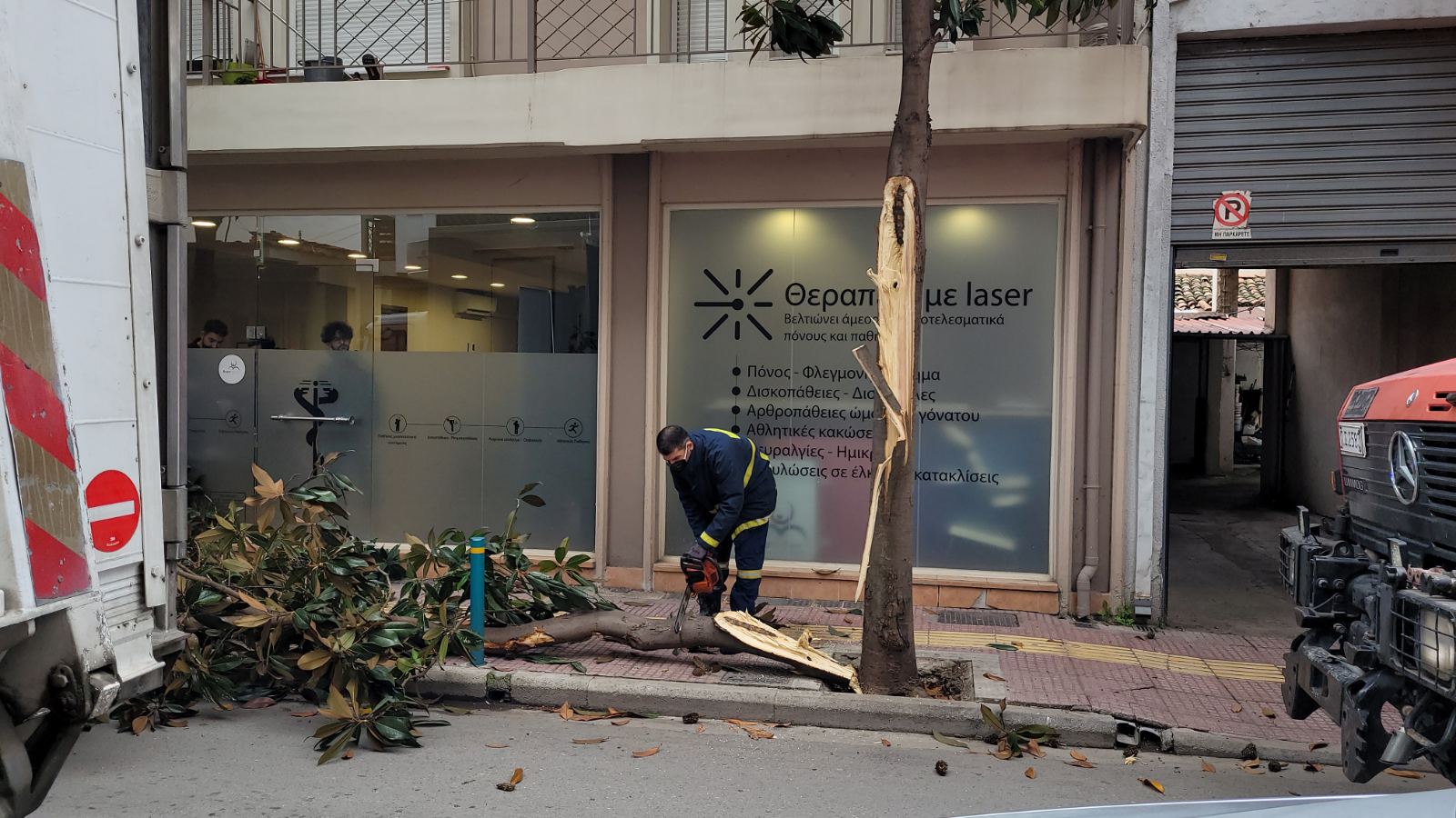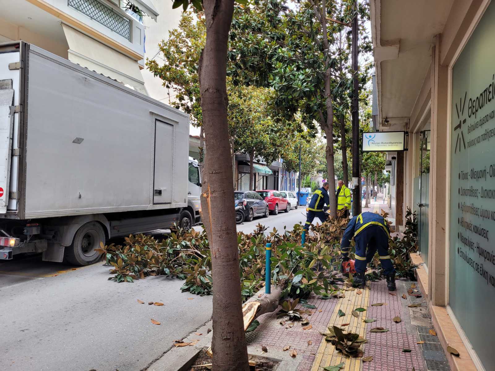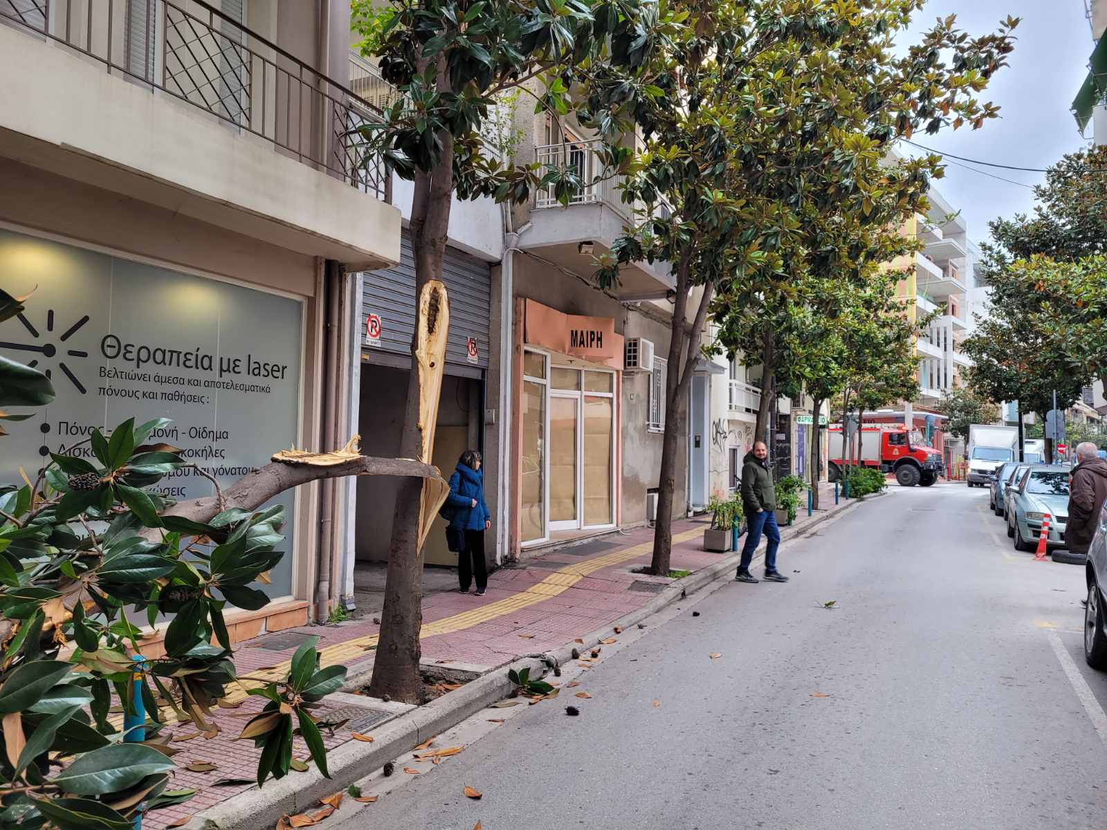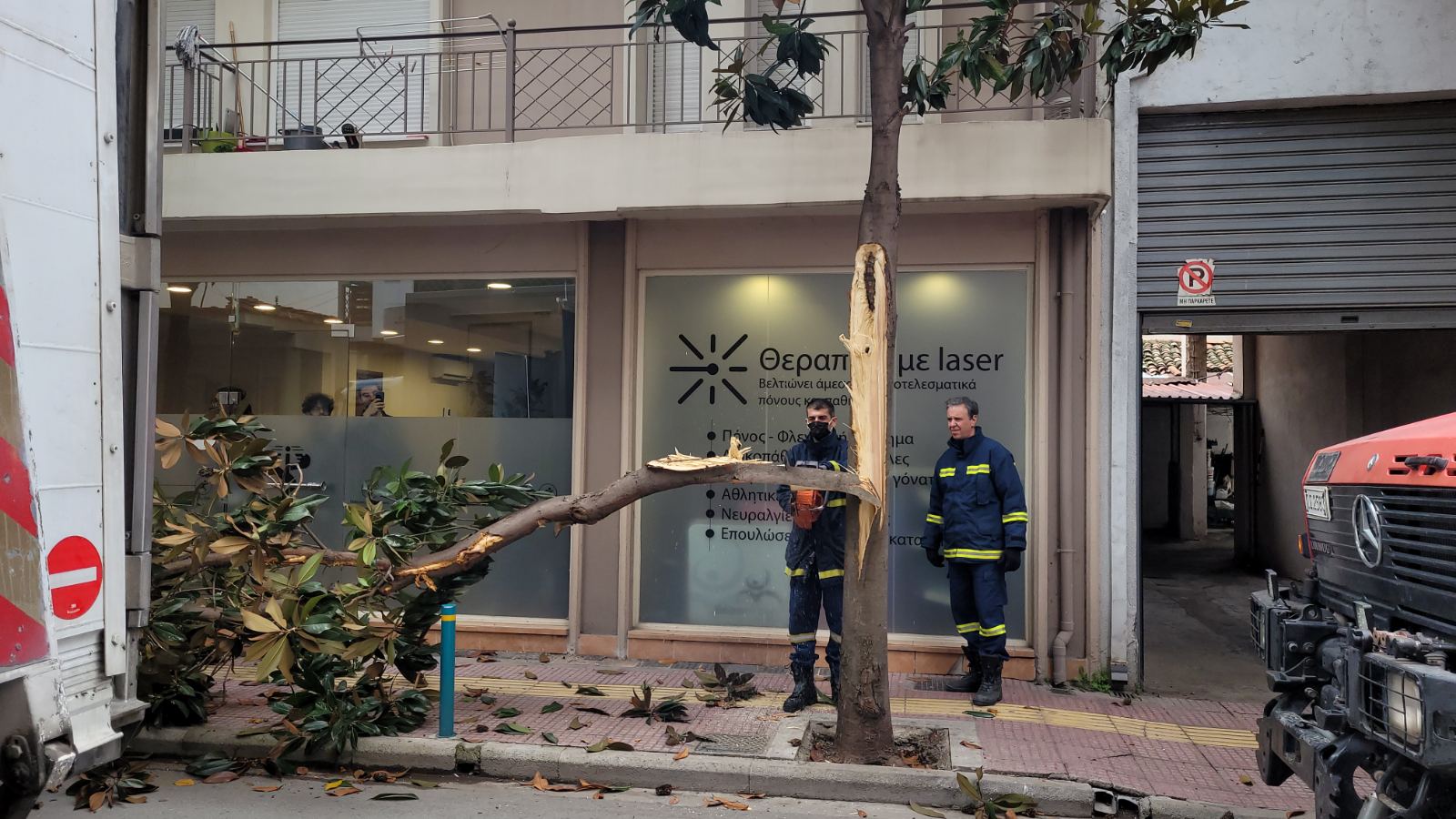Φορτηγό διερχόμενο από τον συγκεκριμένο δρόμο δυσκολευόταν να περάσει καθώς ένα άλλο βαρύ όχημα ήταν διπλοπαρκαρισμένο στο σημείο, με αποτέλεσμα το πρώτο φορτηγό να «ξηλώσει» το μισό δέντρο που βρίσκεται στο πεζοδρόμιο και αυτό να… σκορπίσει στο οδόστρωμα.