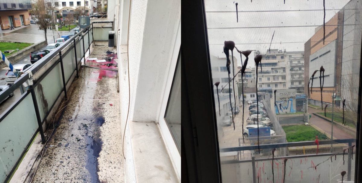 Επίθεση αγνώστων στα γραφεία της νομαρχιακής της Νέας Δημοκρατίας της Λάρισας – Πέταξαν γυάλινα μπουκάλια με μπογιά (φωτό)