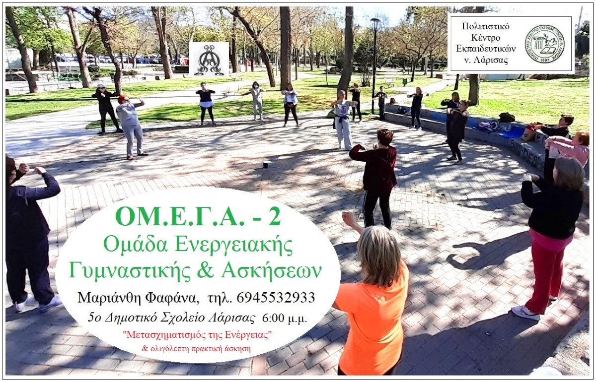 Η Ομάδα απαρτίζεται από 15 έως 20 άτομα, κυρίως γυναίκες αλλά και άντρες, που συναντιούνται 1 φορά την εβδομάδα κι εκτελούν αναπνευστικές κυρίως ασκήσεις και stretching, για εκγύμναση του σώματος, ενδυνάμωση της άμυνας του οργανισμού, ανάπτυξη των ενεργειακών κέντρων, τόνωση ζωτικότητας, ευλυγισία, αντοχή, θεραπεία, εκτόνωση, γαλήνη, αρμονική ζωή, χωρίς άγχη και stress, μέσω τεχνικών χαλάρωσης και αναπνοών, έλεγχος του εαυτού, διατήρηση της ηρεμίας και της αυτοπεποίθησης. Η ΟΜΕΓΑ-2 υποστηρίζεται από το Πολιτιστικό Κέντρο Εκπαιδευτικών ν. Λάρισας, απευθύνεται σε αρχάριους κι έμπειρους, λειτουργεί εθελοντικά και δωρεάν κι όποιος ενδιαφέρεται, μπορεί να τηλεφωνεί για πληροφορίες στην υπεύθυνη, στο 6945532393.