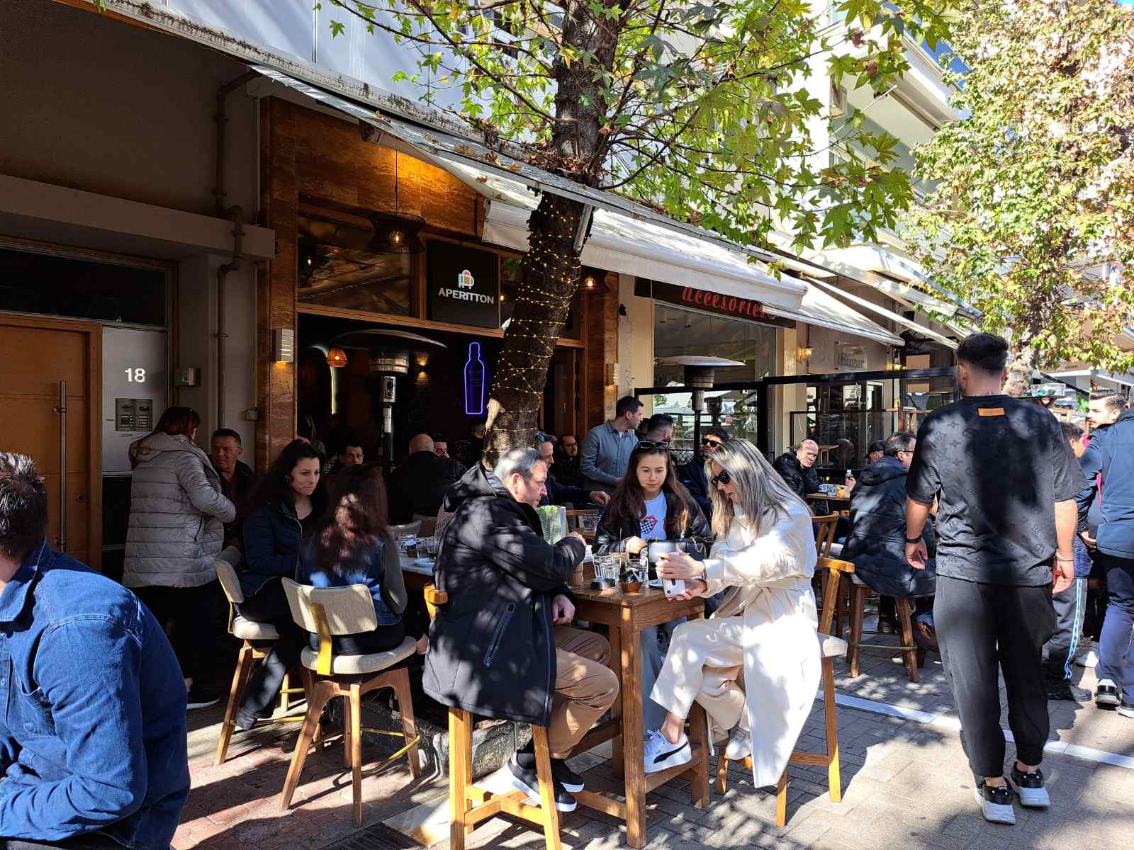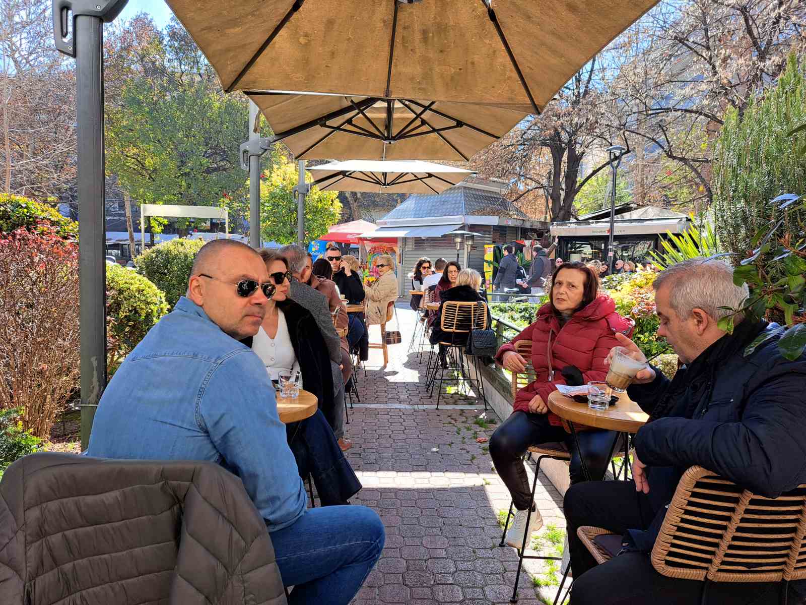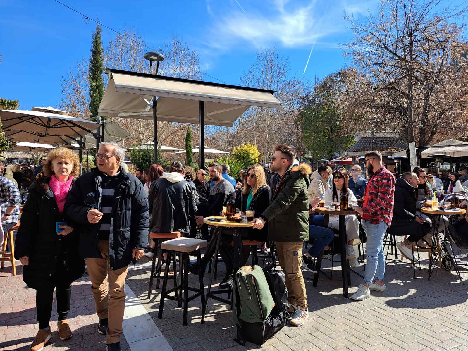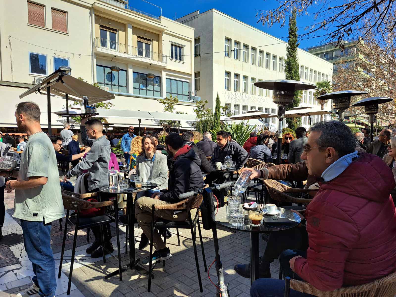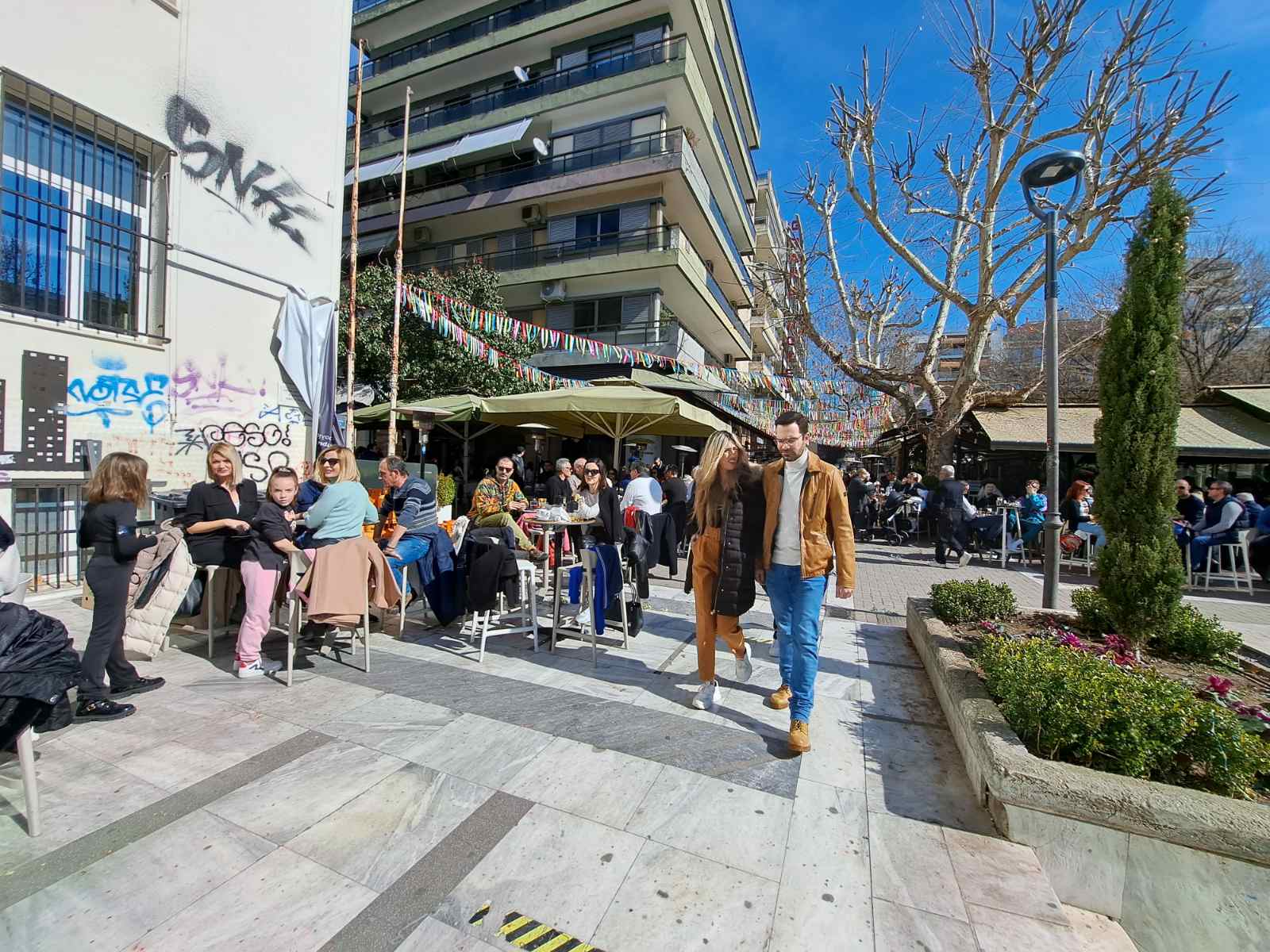 Τον λαμπερό κυριακάτικο ήλιο και την ανοιξιάτικη θερμοκρασία εκμεταλλευτήκαν σήμερα οι Λαρισαίοι βγαίνοντας στο κέντρο της πόλης για περίπατο ή καφέ.