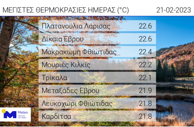 Τα Πλατανούλια της Λάρισας ήταν αυτά που κατέλαβαν την πρωτιά, με την θερμοκρασία να αγγίζει τους 22,6 βαθμούς Κελσίου, ομοίως και τα Δίκαια Έβρου.
