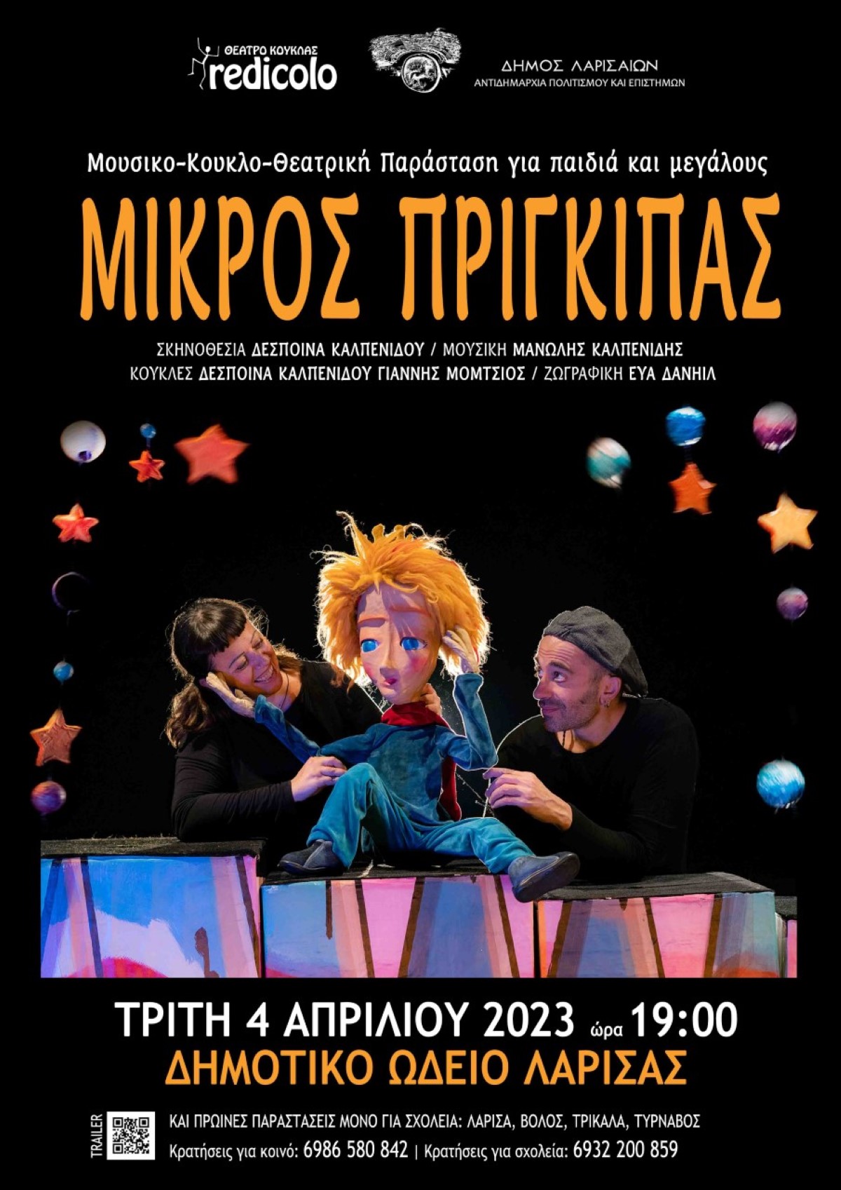 Ο Μικρός Πρίγκηπας από το Θέατρο Κούκλας REDICOLO, μετά τις παραστάσεις του στη Θεσσαλονίκη και την Κεντρική Μακεδονία, έρχεται στη Θεσσαλία με μία παράσταση για το κοινό στο Δημοτικό Ωδείο Λάρισας την Τρίτη 4 Απριλίου στις 19:00, σε συνδιοργάνωση της Αντιδημαρχίας Πολιτισμου και Επιστημών του Δήμου Λαρισαίων, αλλά και με έξι πρωινές παραστάσεις μόνο για σχολεία στον Βόλο, τα Τρίκαλα, τη Λάρισα και τον Τύρναβο.