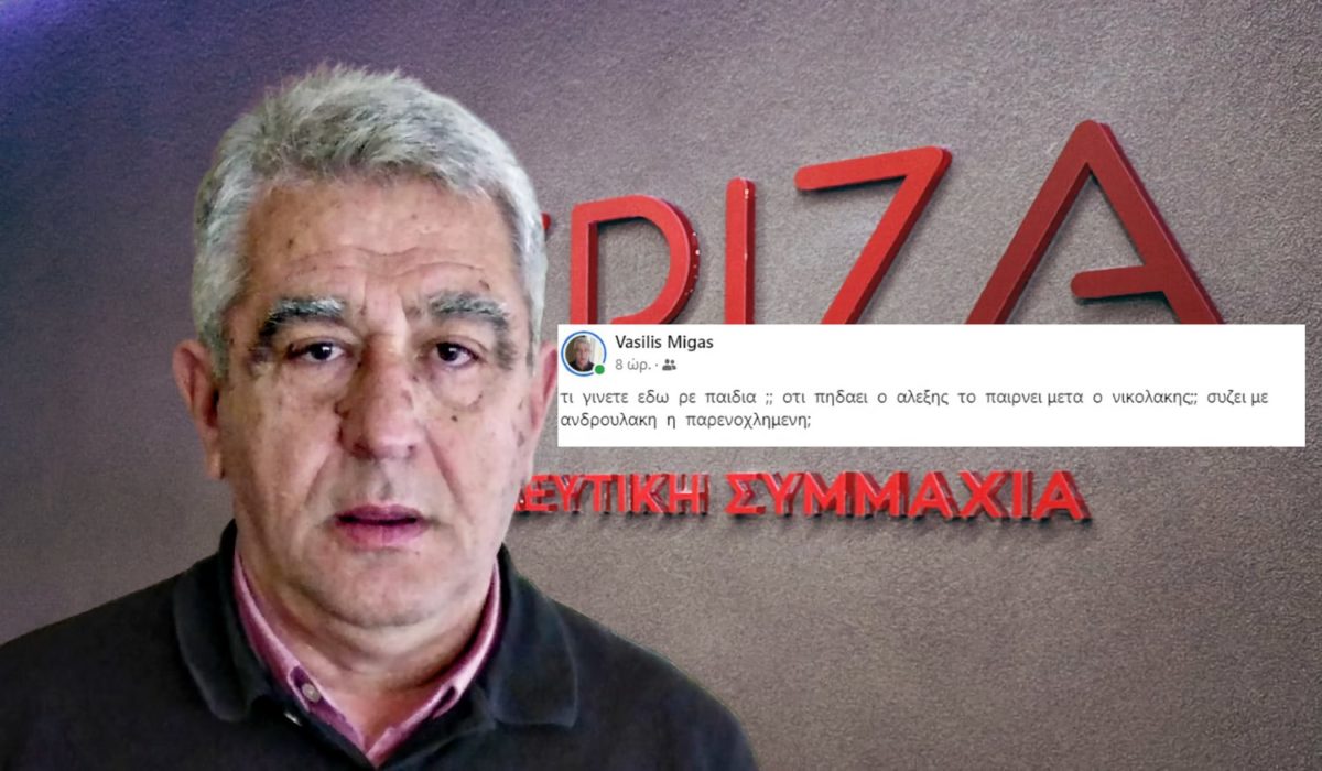 Σε ανάρτησή του στα μέσα κοινωνικής δικτύωσης, ο κ. Μίγας έγραψε: «Τι έγινε ρε παιδιά; Ότι πηδάει ο Αλέξης το παίρνει μετά ο Νικολάκης; Συζεί με Ανδρουλάκη η παρενοχλημένη;
