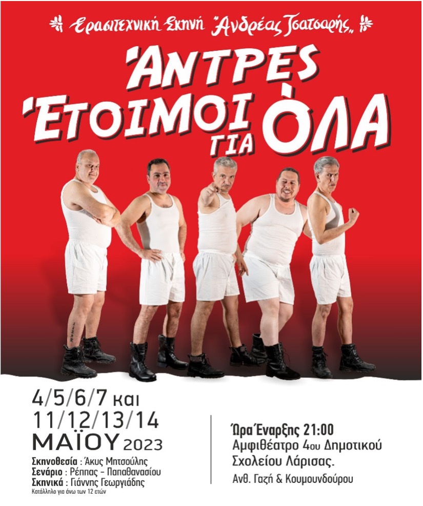 Την Πέμπτη 4 Μαΐου 2023 κάνει πρεμιέρα η κωμωδία των Ρέππα – Παπαθανασίου «Άντρες έτοιμοι για όλα», το νέο έργο της Ερασιτεχνικής σκηνής «Ανδρέας Τσατσαρής». Πρόκειται για μια απολαυστική κωμωδία, όπου πέντε «ελληνάρες» ξεπερνούν τον εαυτό τους προσπαθώντας να βγάλουν χρήματα με τρόπο που αναστατώνει τη μικρή κοινωνία της πόλης που ζουν με τις οικογένειές τους.