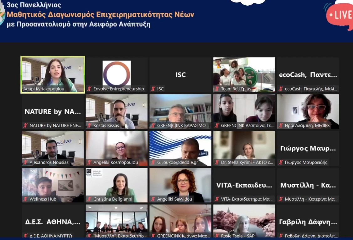 Την Κυριακή 7 Μαΐου στις 11:00 διεξήχθη διαδικτυακά η τελετή βράβευσης των νικητών του 3ου Πανελλήνιου Μαθητικού Διαγωνισμού Επιχειρηματικότητας Νέων με προσανατολισμό στην Αειφόρο Ανάπτυξη. Ο διαγωνισμός διοργανώθηκε από τον οργανισμό Envolve Entrepreneurship με την έγκριση του Υπουργείου Παιδείας και Θρησκευμάτων και κατά γενική ομολογία υπήρξε άψογος από κάθε άποψη. Στον τελικό προκρίθηκαν από όλη την Ελλάδα 10 ομάδες από 118 σχολεία κάθε τύπου.