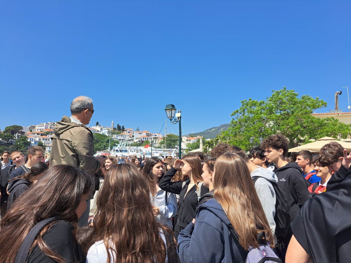 Η Γ’ Γυμνασίου επέλεξε για προορισμό της ένα νησί, την πανέμορφη Σκιάθο, το νησί του συγγραφέα Παπαδιαμάντη. Με λεωφορείο ως την Αμαλιάπολη κι από κει με πλοίο έφτασε στον προορισμό της. Οι μαθητές/τριες περιηγήθηκαν στα σοκάκια του νησιού, επισκέφθηκαν τις εκκλησίες στο εσωτερικό και στα ψηλώματα, είδαν το σπίτι του Παπαδιαμάντη, έφτασαν ως το Μπούρτζι και απόλαυσαν το απέραντο γαλάζιο της θάλασσας, γεμίζοντας την ψυχή και τα μάτια τους με το μπλε του ουρανού και της θάλασσας. Τα παιχνιδιάρικα δελφίνια συνόδευαν το ταξίδι τους στο πήγαινε και στην επιστροφή, λες και ζήλευαν τον χορό και τα τραγούδια των παιδιών. Συνοδοί εκπαιδευτικοί: Δεληζώνα Ζωή, Κατσαβός Γιάννης, Καρρά Αποστολία, Λαζινού Νανά, Μαλλιοπούλου Λίνα και Μπασδέκη Αρετή