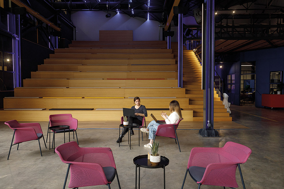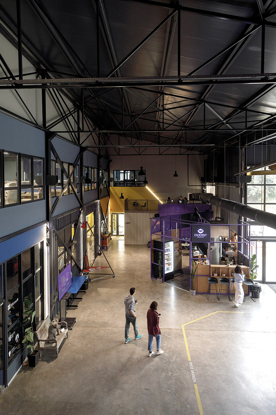 Κλειστό για μία διετία, το αχανές βιομηχανικό κτίριο είχε ακόμη εμπορεύματα κάτω από την τσίγκινη σκεπή του, όπως πόμολα και λογής λογής σίδερα. Το στοίχημα να μετατραπεί αυτός ο χώρος, στον οποίο πραγματοποιούνταν φορτώσεις-εκφορτώσεις, σε ένα σύγχρονο πάρκο επιχειρηματικής καινοτομίας δεν ήταν εύκολο. «Προχωρήσαμε σε ενεργειακή αναβάθμιση με ενεργητικά και παθητικά συστήματα, διατηρήσαμε τον χαρακτήρα του και δώσαμε έμφαση στην κυκλική οικονομία, εφαρμόζοντας ένα εκτενές πρόγραμμα επαναχρησιμοποίησης υλικών», περιγράφει ο αρχιτέκτονας Αντώνης Μόρας και η ομάδα του aether:arch.