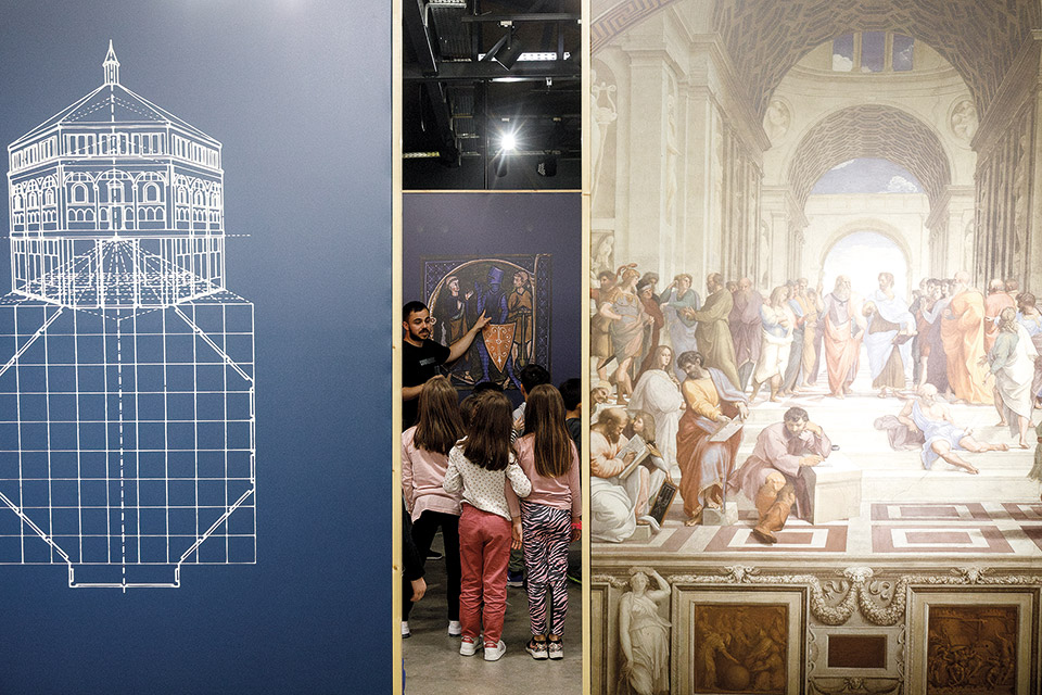Μαθητές Δημοτικού από τη Θεσσαλονίκη ξεναγούνται στην έκθεση που φιλοξενείται στον χώρο, με θέμα την ιστορία της καινοτομίας