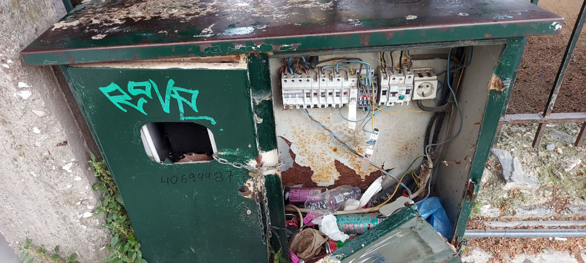 Το εξωτερικό μεταλλικό περίβλημα – κουτί πίνακα της ΔΕΗ σε κεντρικότατο και πολυσύχναστο σημείο στο κέντρο της Αγιάς είναι διαλυμένο και αποτελεί πραγματικά κίνδυνο – θάνατο.