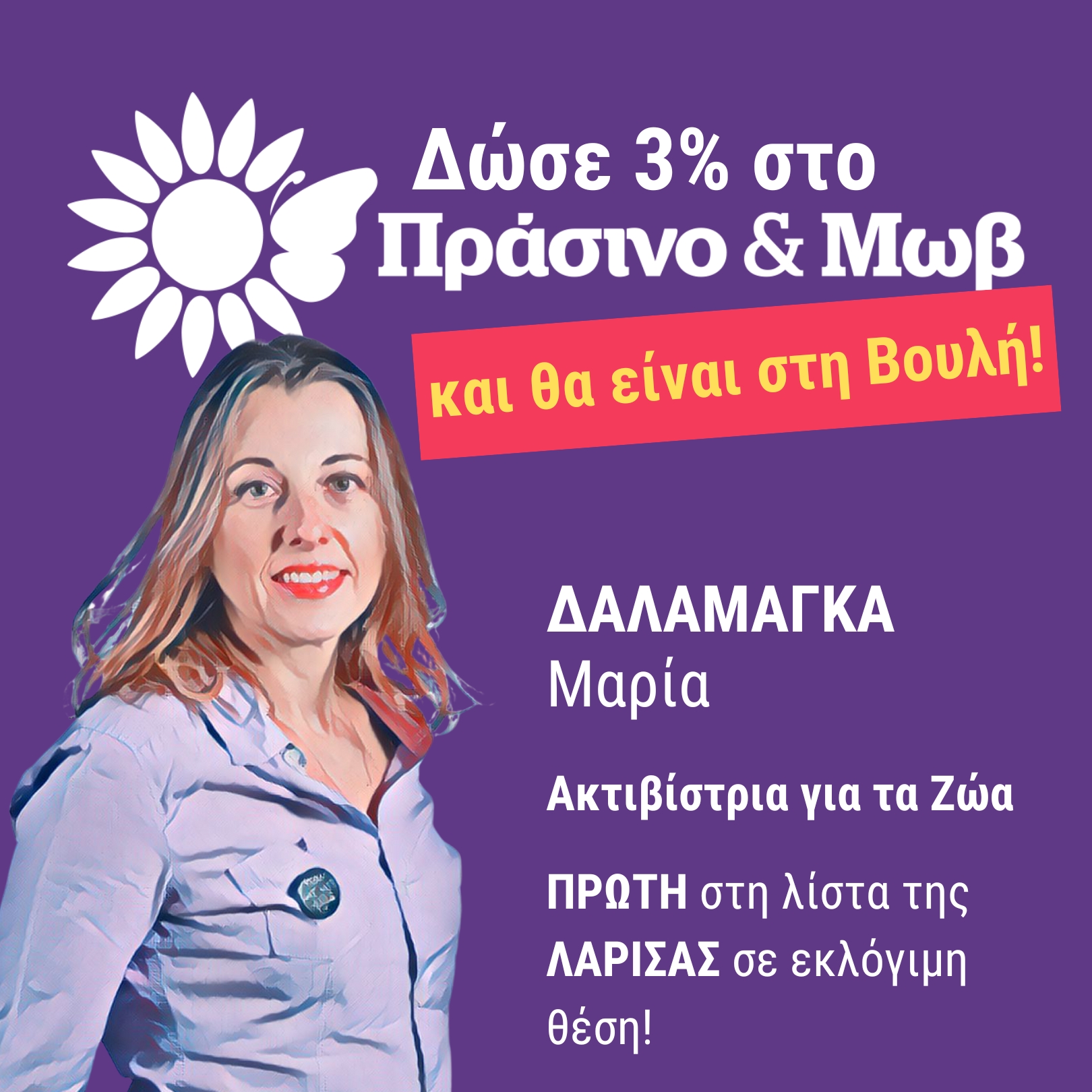 Η συμμαχία Πράσινο και Μωβ αποφάσισε να δώσει σε εμάς, τους φιλόζωους, τρεις πρωτιές σε ψηφοδέλτια, σε περιφέρειες που θα εκλέξουν βουλευτή εάν το Πράσινο και Μωβ μπει στη Βουλή. Η Γεωργία Αγγελοπούλου είναι επικεφαλής στον Βόρειο Τομέας της Αθήνας, η Ελένη Δανά στο Ηράκλειο Κρήτης, και εγώ στη Λάρισα. Αυτό σημαίνει πως εάν το Πράσινο και Μωβ ξεπεράσει το 3%, θα εκλεγούν στη Βουλή των Ελλήνων από μία έως και τρεις φιλόζωες ακτιβίστριες! Εάν το πετύχουμε αυτό, η Ελλάδα θα γίνει η τρίτη χώρα, μετά την Πορτογαλία και την Ολλανδία, με παρουσία της πολιτικής φιλοζωίας στο εθνικό της Κοινοβούλιο. Ξέρουμε πως όπου συνέβη αυτό, επηρεάστηκαν όλες οι πολιτικές δυνάμεις και ξαφνικά η φιλοζωία και οι φιλόζωοι μετακινήθηκαν από το περιθώριο στο κέντρο της πολιτικής συζήτησης! Η προοπτική να εκλεγούν φιλόζωες στην Ελλάδα -και μάλιστα τρεις γυναίκες- συγκινεί το διεθνές μας κίνημα, που έχει στρέψει το βλέμμα προς την Ελλάδα.