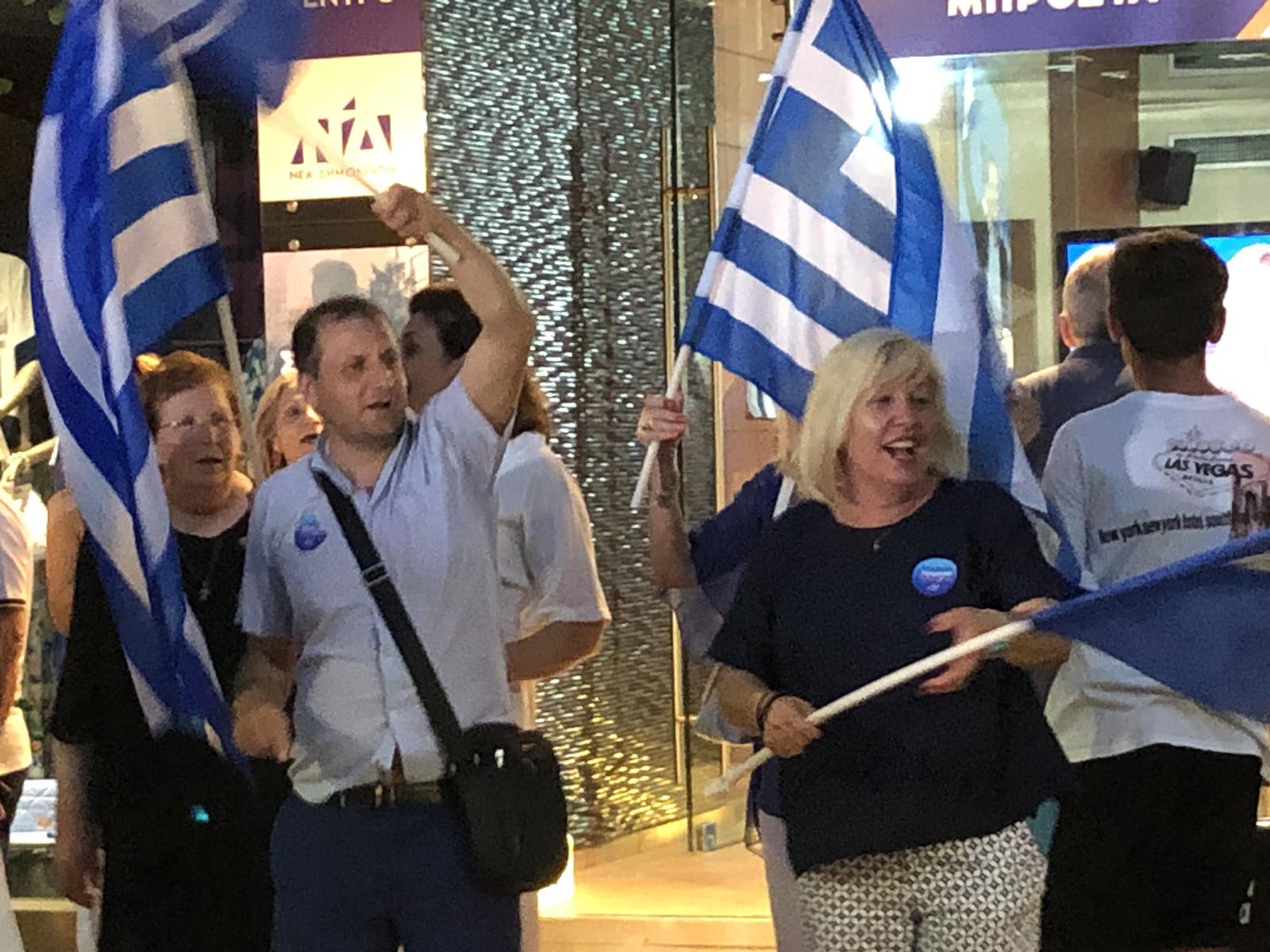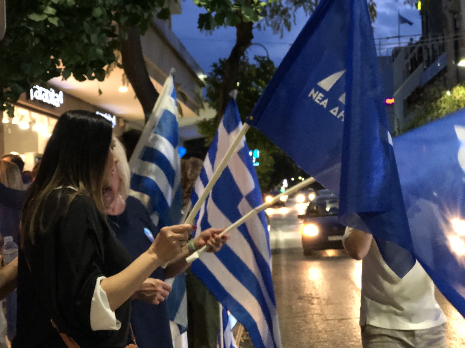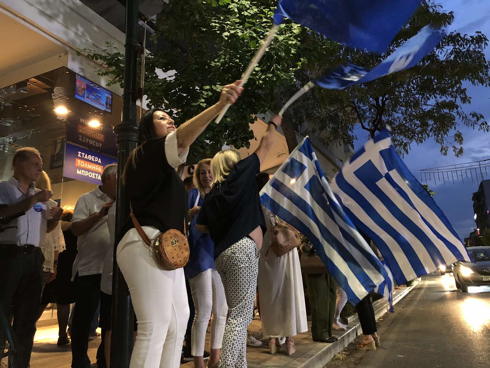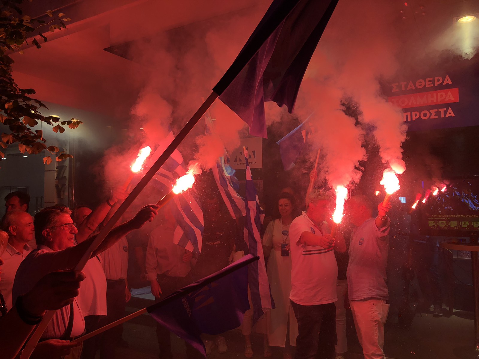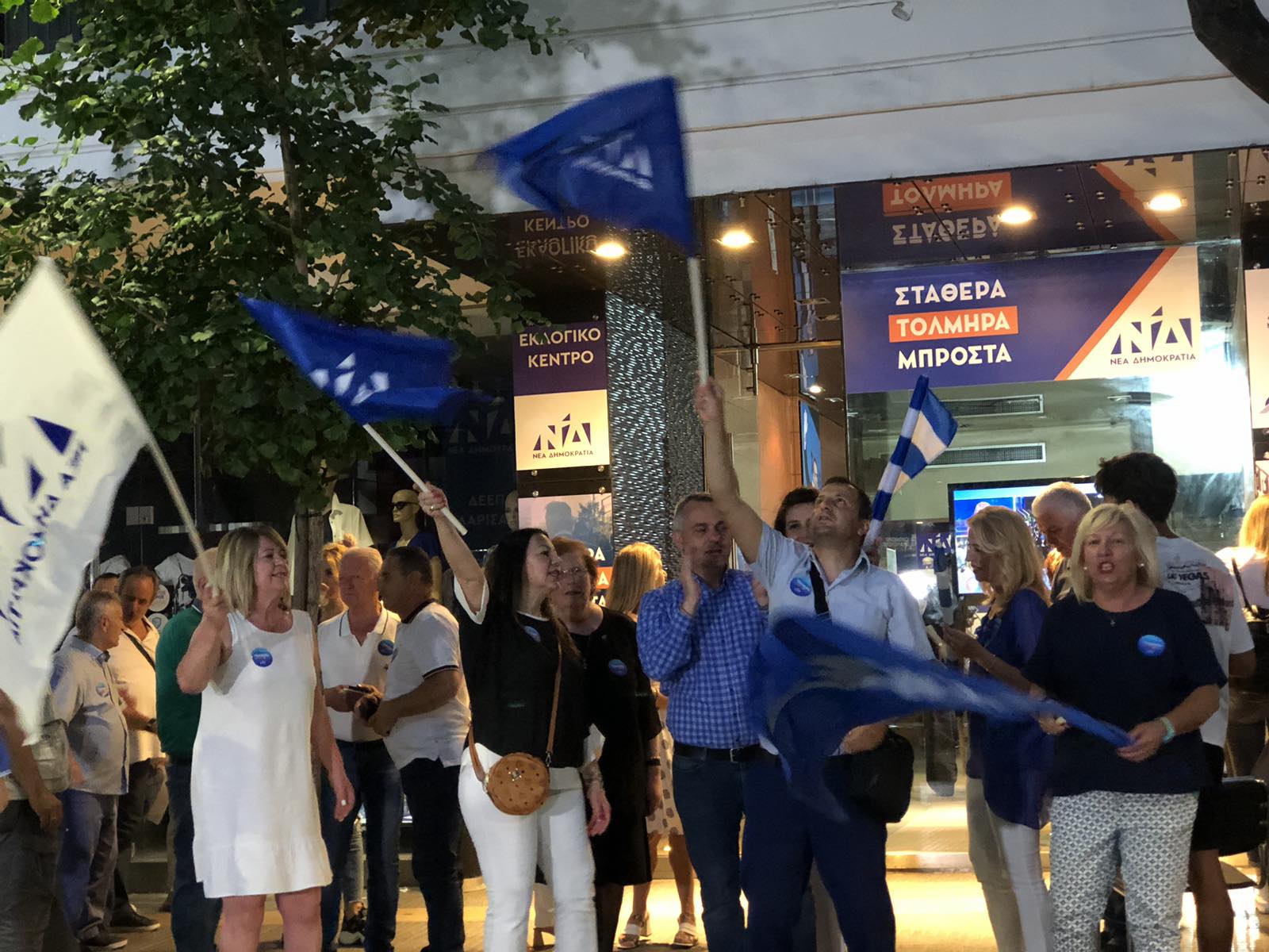 Πλήθος κόσμου, υποστηρικτών της Νέας Δημοκρατίας βρίσκονται στο κέντρο της Λάρισας το βράδυ της Κυριακής, για να γιορτάσουν τη μεγάλη νίκη του κόμματος, έξω από το εκλογικό κέντρο επί της οδού Κύπρου.