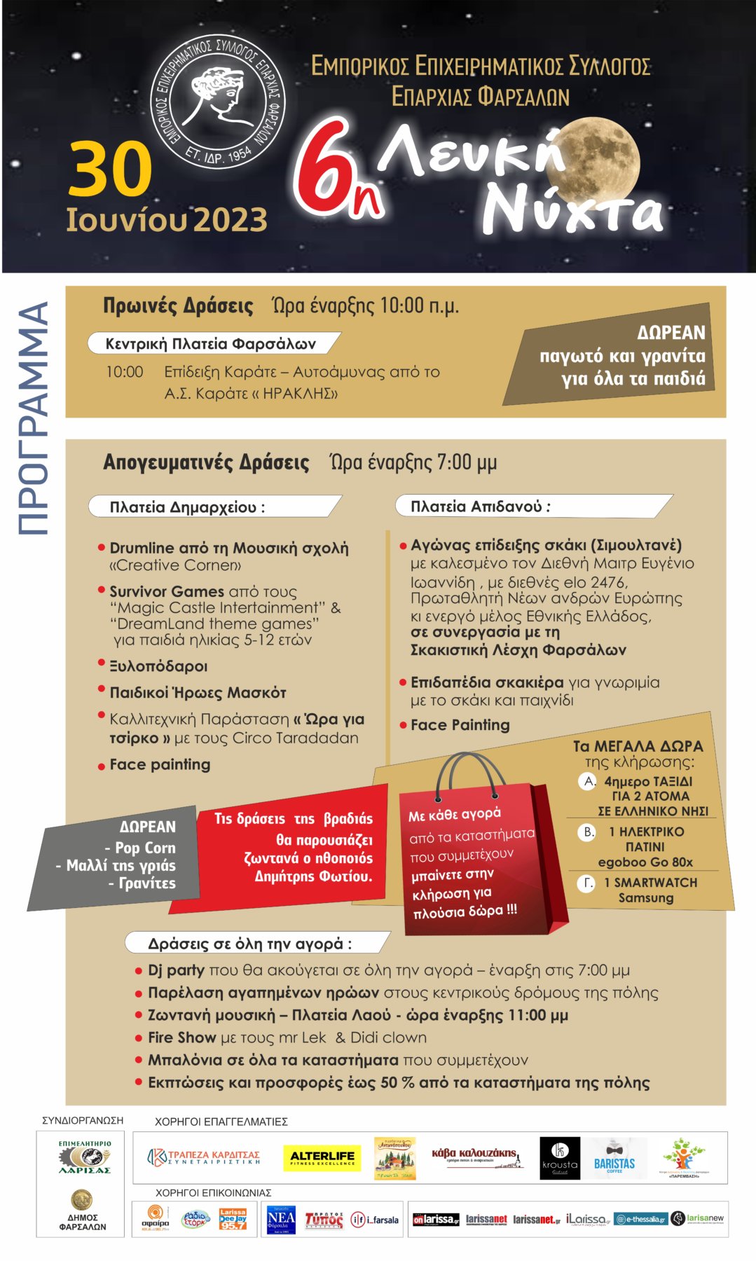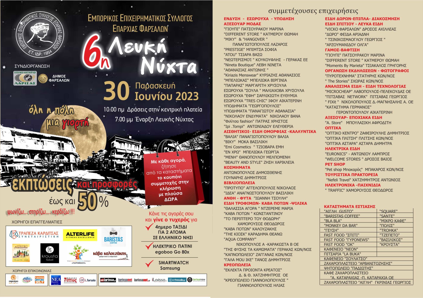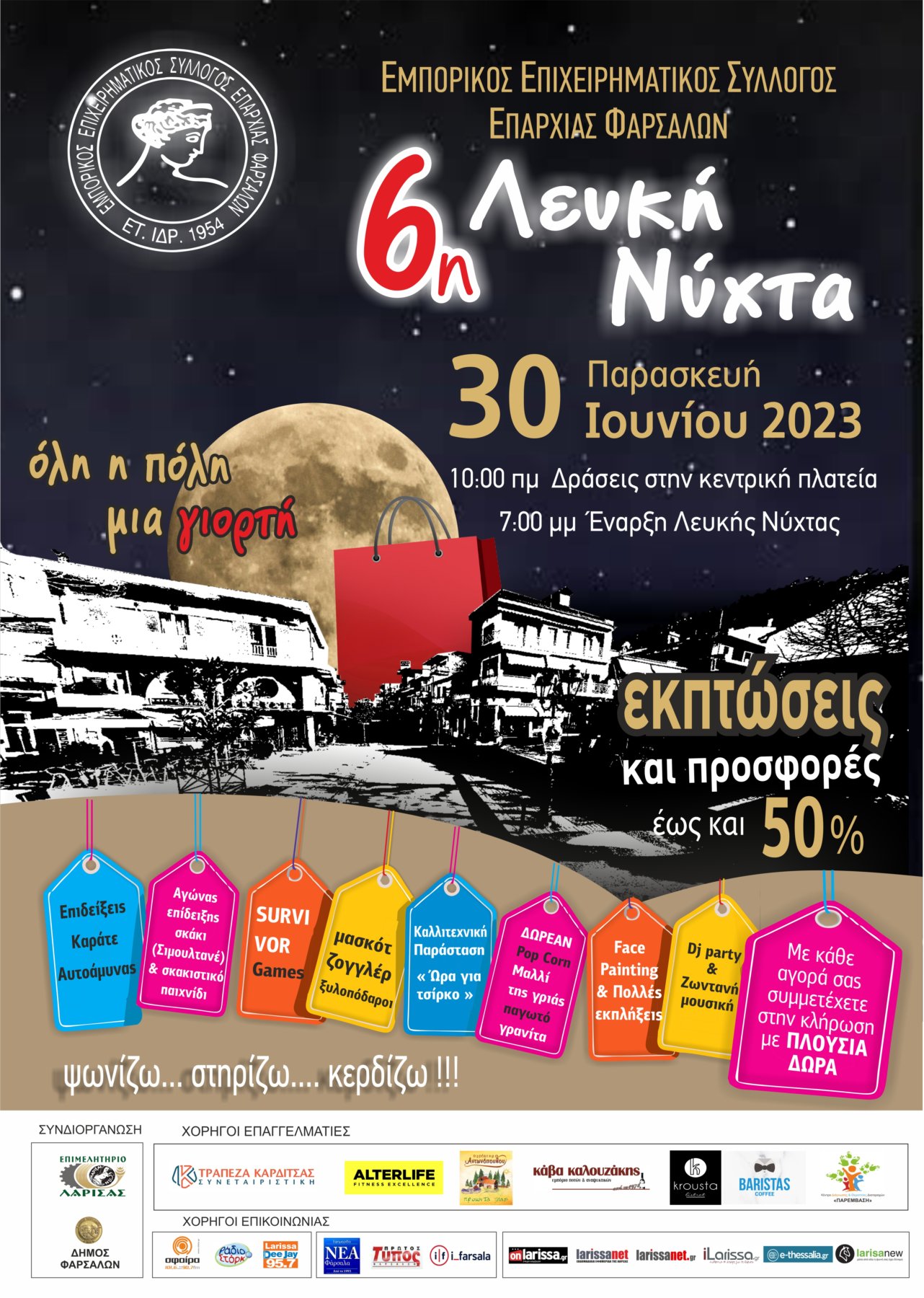 Με στόχο την τόνωση και τη στήριξη της αγοράς, ο Εμπορικός Επιχειρηματικός Σύλλογος Επαρχίας Φαρσάλων διοργανώνει την Παρασκευή 30 Ιουνίου, την 6η Λευκή Νύχτα.