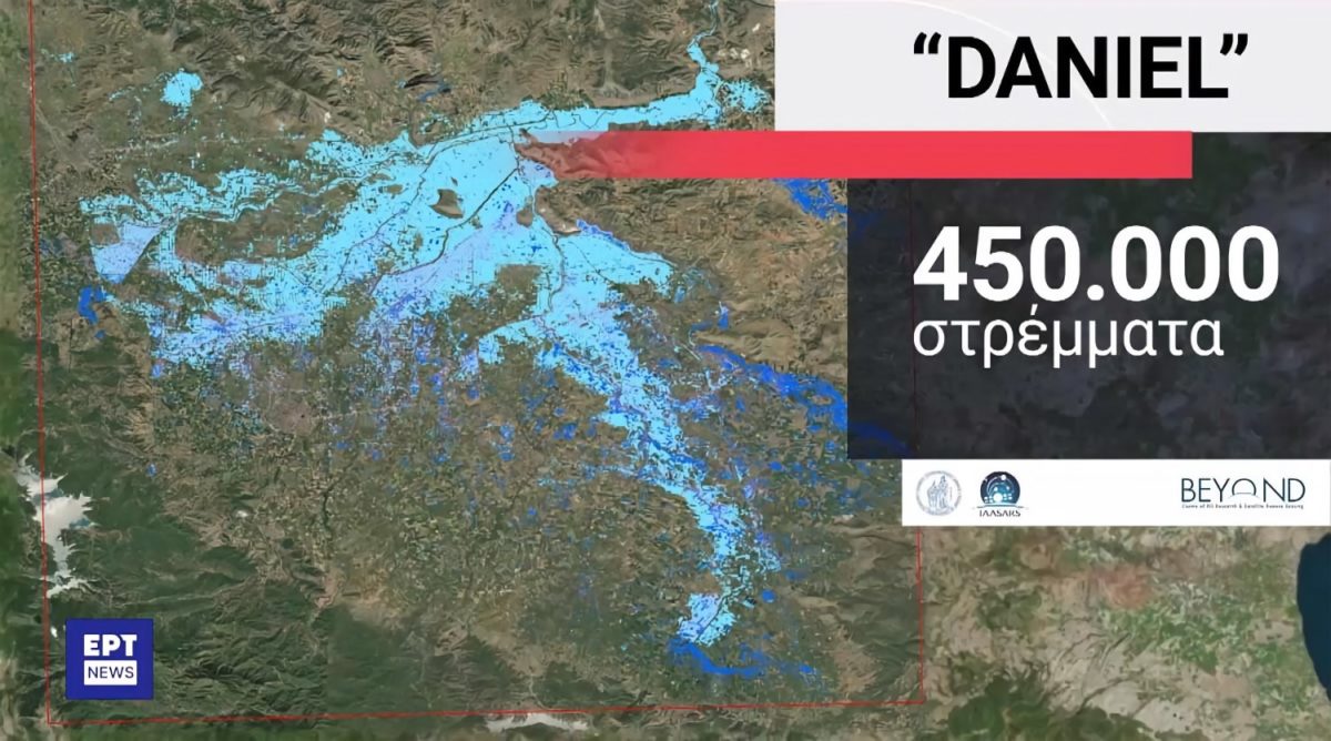 Στη δορυφορική εικόνα, που ανέλυσε το κέντρο BEYOND του Αστεροσκοπείου Αθηνών, αποτυπώνεται η έκταση που πλημμύρισε από την κακοκαιρία Daniel και είναι τριπλάσια σε σύγκριση με την έκταση που είχε κατακλυστεί από τον Ιανό.
