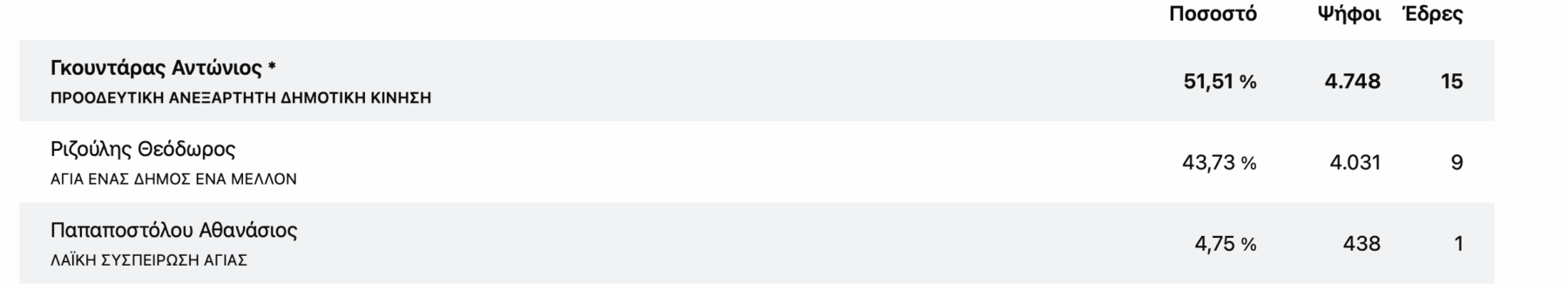 Ο Αντώνης Γκουντάρας και η ΠΑΔΗΚ πήραν πρωτιά στον Δήμο Αγιάς και βάσει του Υπουργείου Εσωτερικών το τελικό αποτέλεσμα καθώς και η τελική σταυροδοσία έχουν ως εξής: