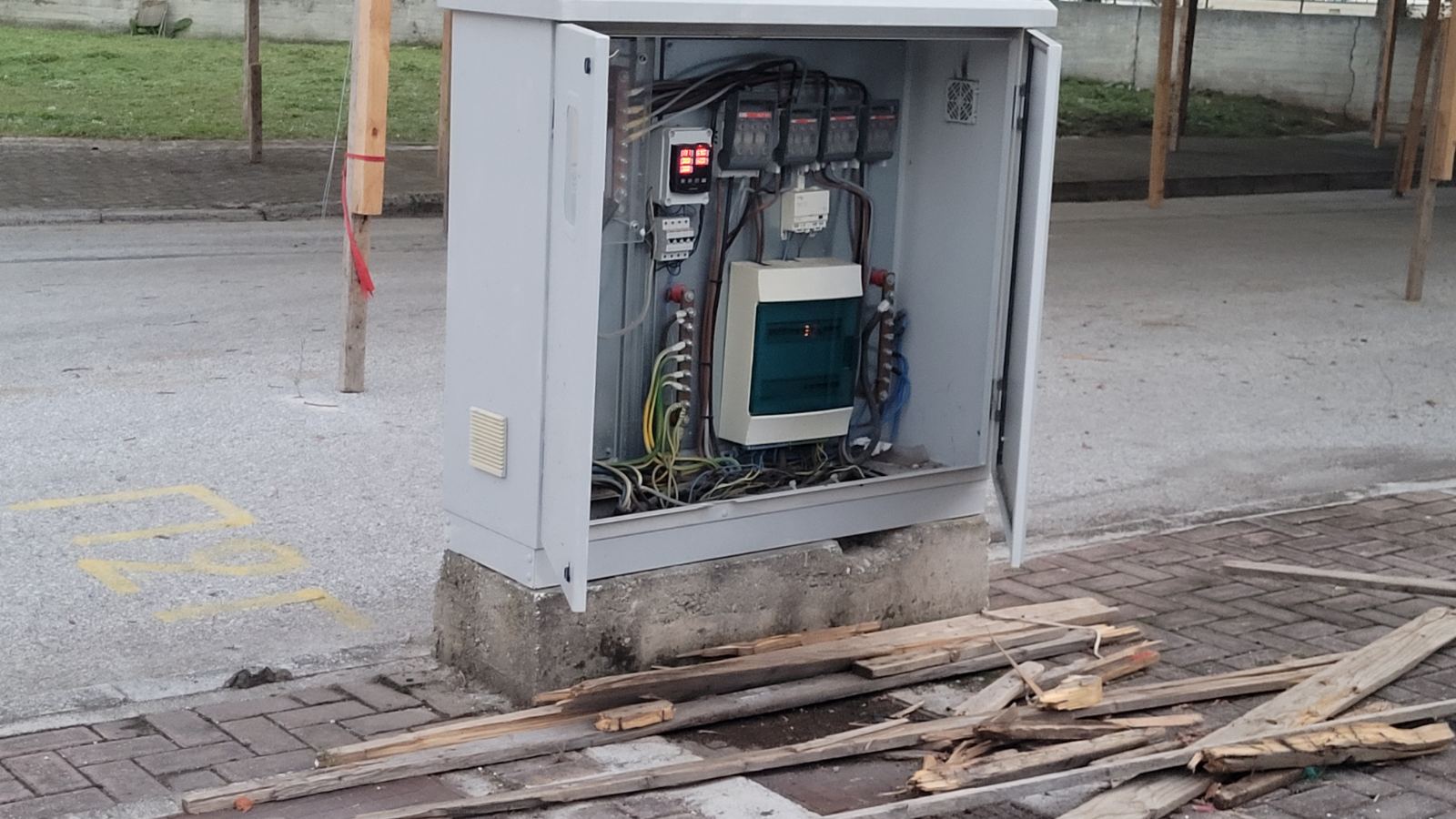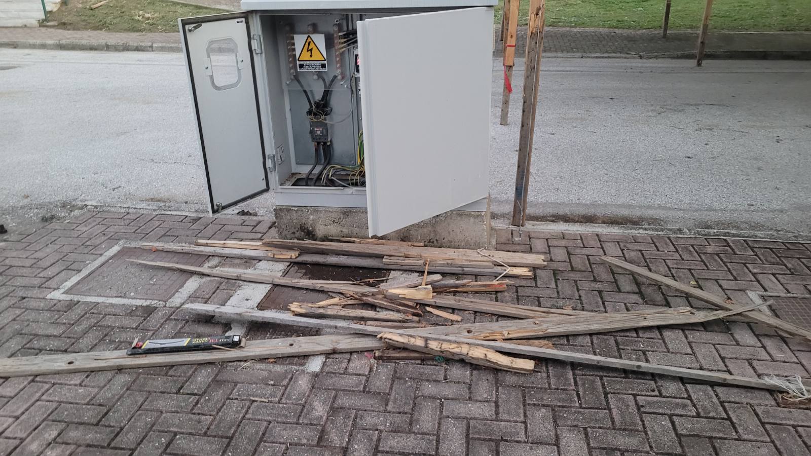 Πράγματι, σε αυτοψία του onlarissa.gr στο σημείο, κομμάτια ξύλων (πολλά απ’ αυτά με καρφιά) βρίσκονται σπασμένα και πεταμένα. Φυσικά, εντύπωση και έντονη ανησυχία προκαλεί κιβώτιο διανομής ρεύματος της ΔΕΗ, το οποίο για άγνωστο λόγο εντοπίζεται ξεκλείδωτο, τη στιγμή που δεκάδες παιδιά διέρχονται από εκεί καθημερινά.