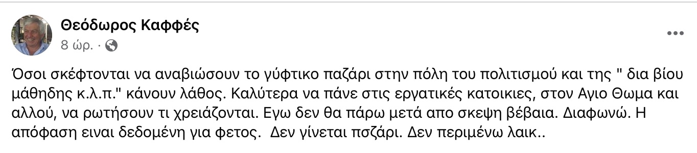 Πρώτος τον… χορό των αντιδράσεων σέρνει ο αντιδήμαρχος Περιβάλλοντος κ. Θεόδωρος Καφφές ο οποίος σε ανάρτησή του στα μέσα κοινωνικής δικτύωσης έγραψε το εξής: «Όσοι σκέφτονται να αναβιώσουν το γύφτικο παζάρι στην πόλη του πολιτισμού και της ” δια βίου μάθησης κ.λ.π.” κάνουν λάθος. Καλύτερα να πάνε στις εργατικές κατοικιες, στον Αγιο Θωμα και αλλού, να ρωτήσουν τι χρειάζονται. Εγω δεν θα πάρω μετά απο σκεψη βέβαια. Διαφωνώ. Η απόφαση ειναι δεδομένη για φετος. Δεν γίνεται πσζάρι. Δεν περιμένω λαικ..»