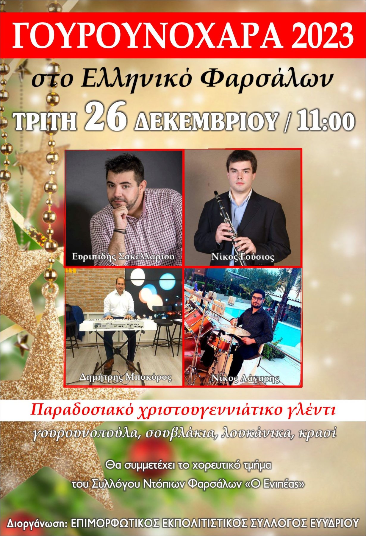 «Ελάτε για ένα Χριστουγεννιάτικο παραδοσιακό γλέντι με παραδοσιακή ορχήστρα, γουρουνοπούλα, σουβλάκια, λουκάνικα και άφθονο κρασί» αναφέρει σχετική ανακοίνωση.