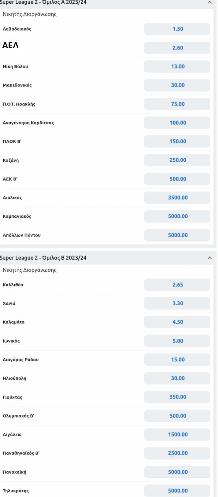 Με αφορμή τη διακοπή του πρωταθλήματος της Superleague 2 για τα Χριστούγεννα, το aelole.gr συγκέντρωσε και σας παραθέτει τις νέες στοιχηματικές αποδόσεις ομάδων και των δύο ομίλων για την 1η θέση.