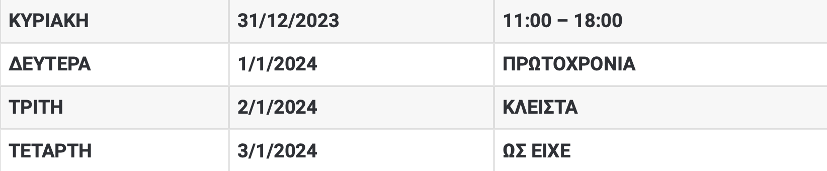 Βάσει του ωραρίου λειτουργίας που έχει ανακοινώσει ο Εμπορικός Σύλλογος, οι καταναλωτές μπορούν να ολοκληρώσουν τα ψώνια τους για την Πρωτοχρονιά τις παρακάτω ώρες