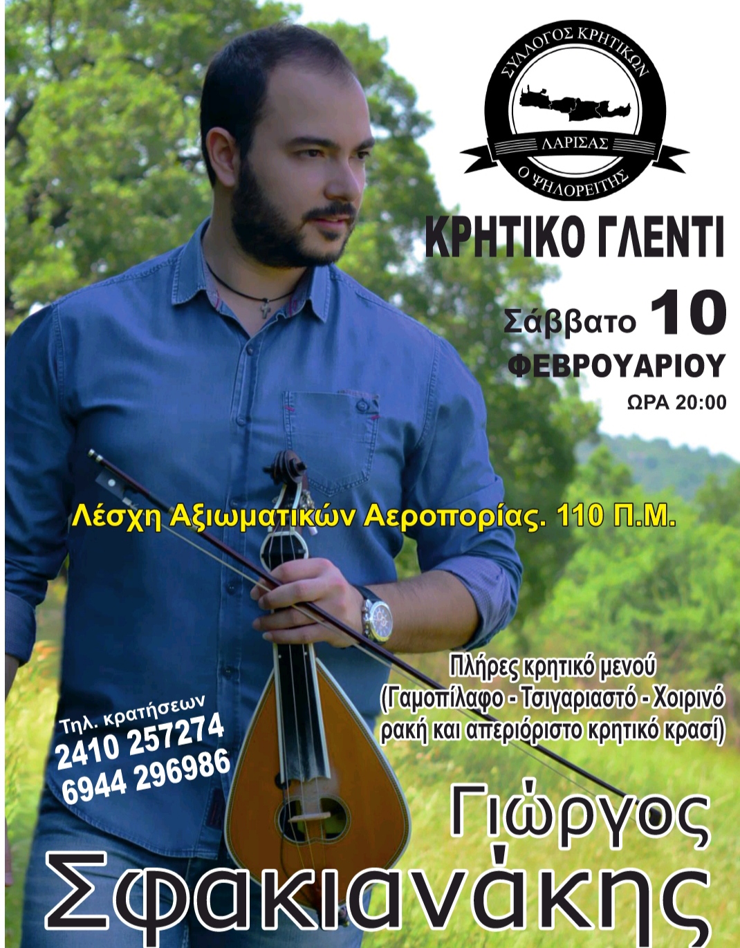 Κρητικό γλέντι του Συλλόγου Κρητικών Λάρισας διοργανώνεται στη Λέσχη Αξιωματικών Αεροπορίας 110 Π.Μ. Λάρισας, το Σάββατο 10 Φεβρουαρίου 2024 και από ώρα 8 το βράδυ.