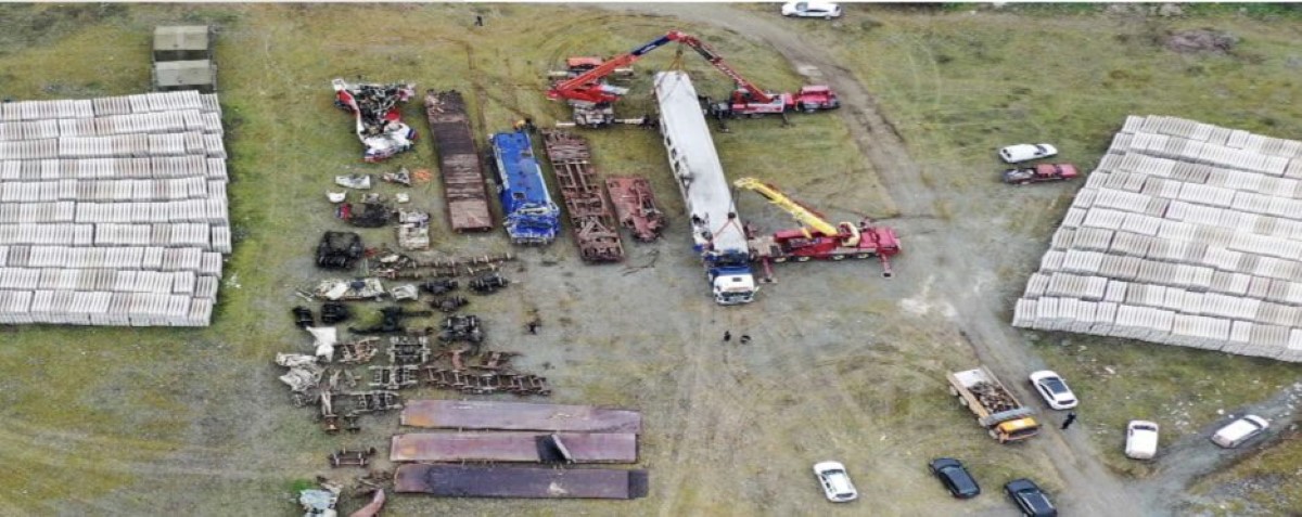 «Φωτογραφία με την αμαξοστοιχία μεταφόρτωσης των αντικειμένων και μεταφοράς τους σε άγνωστη κατεύθυνση, αφού στην θέση Κουλούρι δεν βρέθηκαν. Είναι εμφανής η συνεχόμενη παρουσία της βοηθητικής αμαξοστοιχίας με τα κίτρινα βαγόνια και με φορά που επιτρέπει φόρτωση αυτών των στοιχείων.-πειστηρίων».