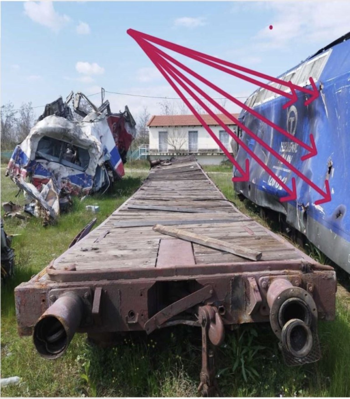 Στις φωτογραφίες φαίνονται κάποιες λαμαρίνες, λεπτές στην κατασκευή, οι οποίες «δεν προσομοιάζουν με κανένα από τα τμήματα των αμαξοστοιχιών, φαίνονται δε ανεπηρέαστα από την καύση, γεγονός που- σύμφωνα με τον κ. Κοκοτσάκη- αποδεικνύει ότι εκτινάχθηκαν στις πρώτες στιγμές της διαρροής, λόγω απότομης διόγκωσης».